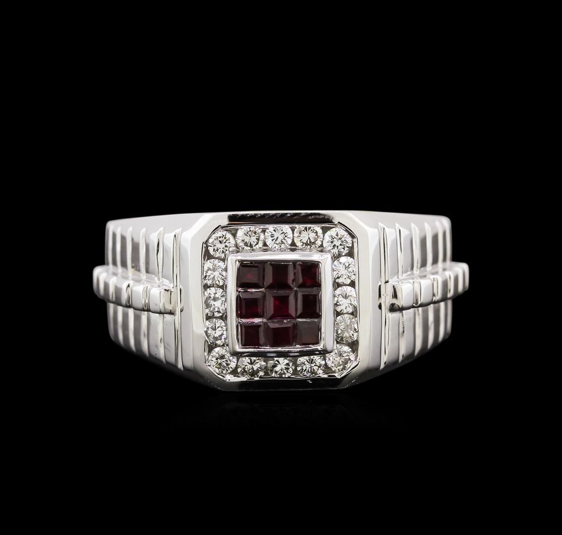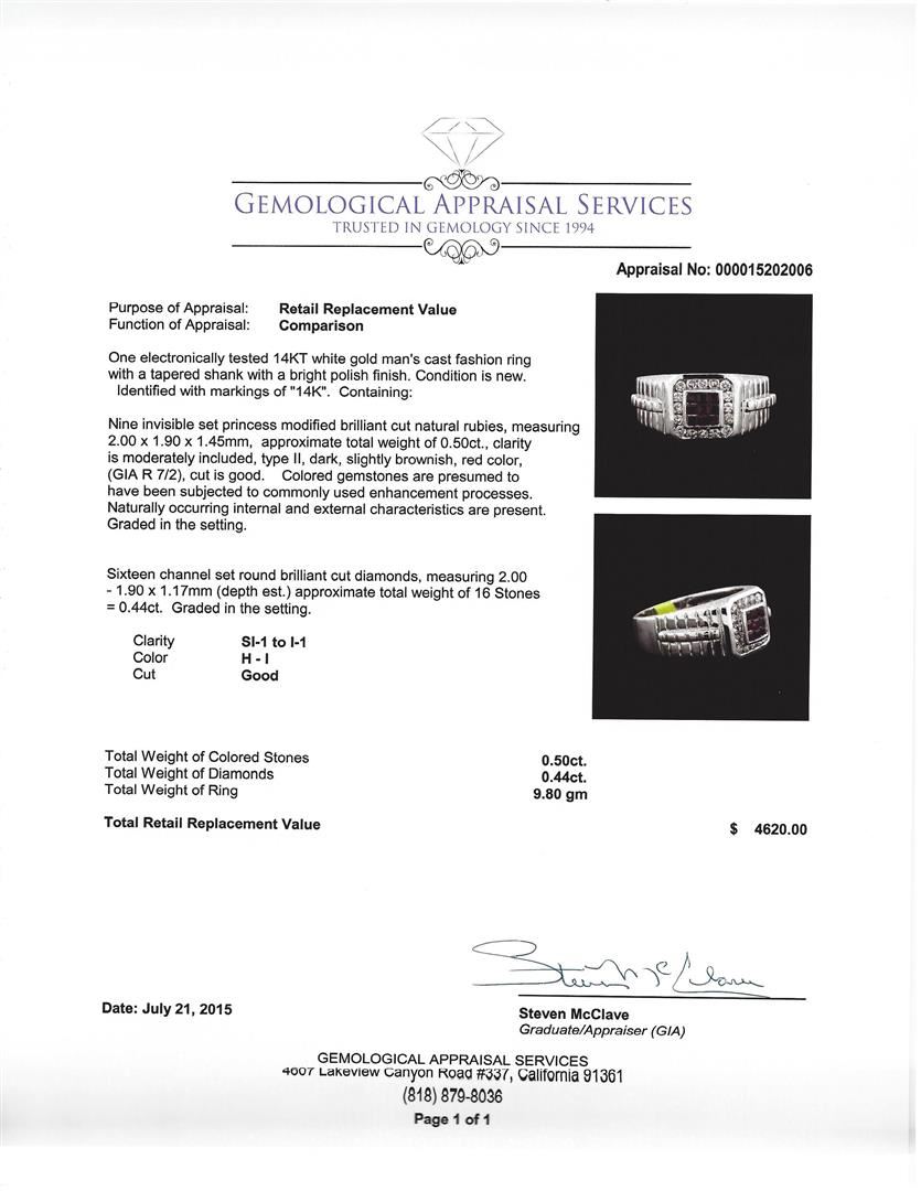 One electronically tested 14KT white gold man's cast fashion ring with a tapered shank with a bright polish finish. Condition is new. Identified with markings of "14K". Containing: Nine invisible set princess modified brilliant cut natural rubies, measuring 2.00 x 1.90 x 1.45mm, approximate total weight of 0.50ct., clarity is moderately included, type II, dark, slightly brownish, red color, (GIA R 7/2), cut is good. Colored gemstones are presumed to have been subjected to commonly used enhancement processes. Naturally occurring internal and external characteristics are present. Graded in the setting. Sixteen channel set round brilliant cut diamonds, measuring 2.00 - 1.90 x 1.17mm (depth est.) approximate total weight of 16 Stones = 0.44ct. Graded in the setting. Clarity: SI-1 to I-1. Color: H - I. Cut: Good. Total Weight of Colored Stones: 0.50ct. Total Weight of Diamonds: 0.44ct. Total Weight of Ring: 9.80 gm. GAS Appraised at $4,620.00.