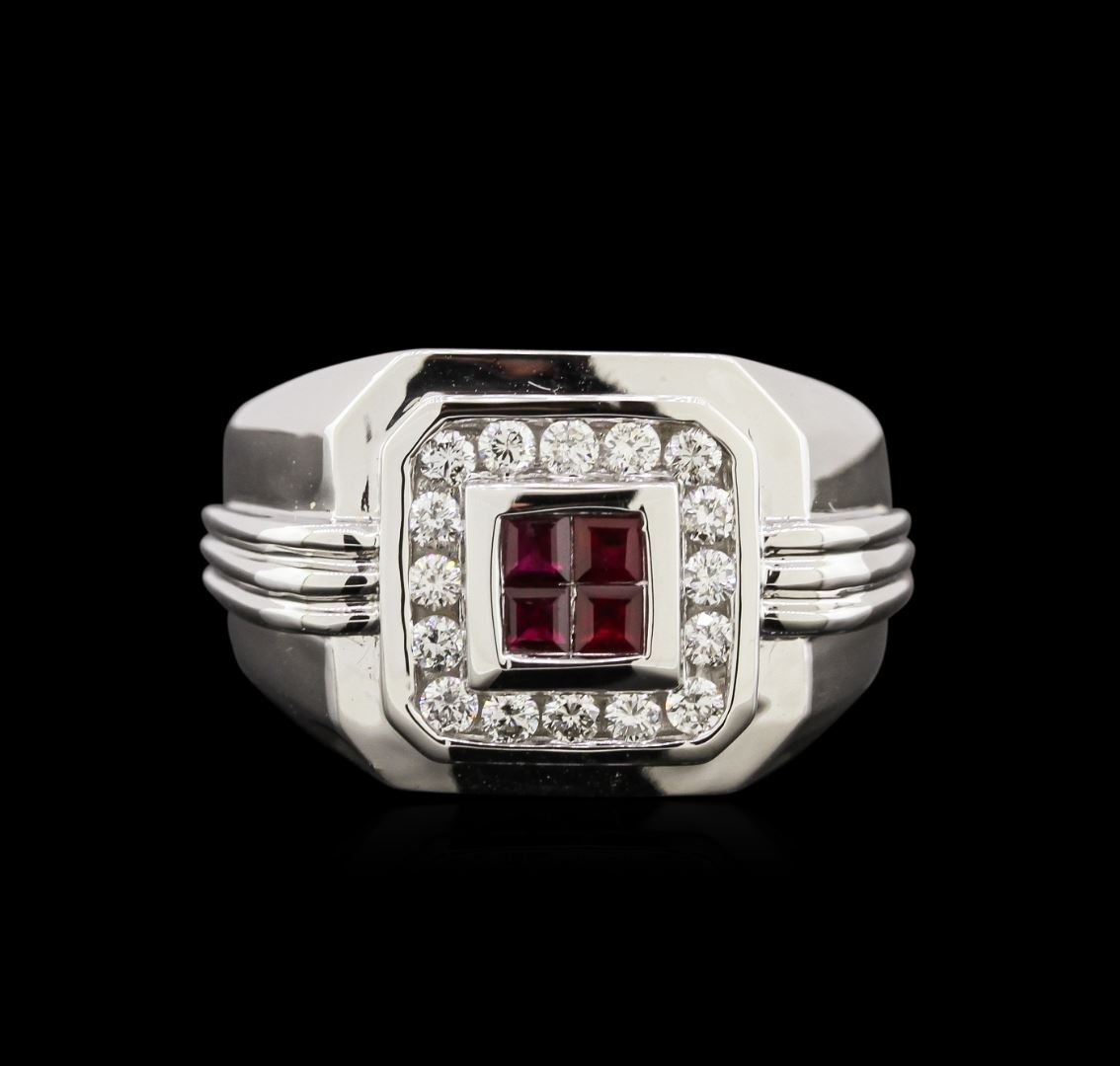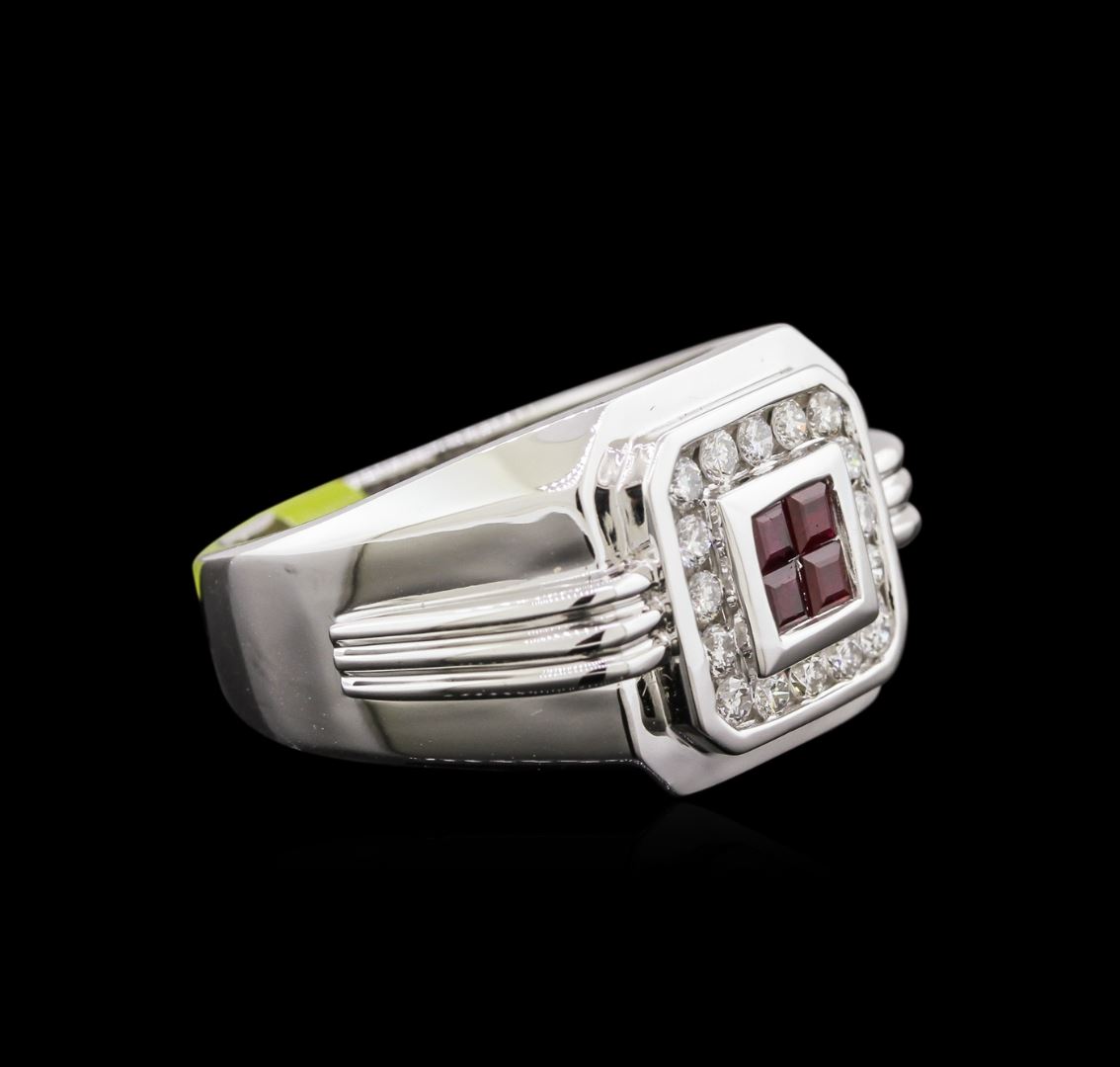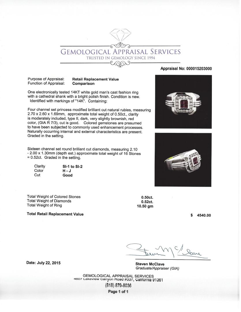 One electronically tested 14KT white gold man's cast fashion ring with a cathedral shank with a bright polish finish. Condition is new. Identified with markings of "14K". Containing: Four channel set princess modified brilliant cut natural rubies, measuring 2.70 x 2.60 x 1.69mm, approximate total weight of 0.50ct., clarity is moderately included, type II, dark, very slightly brownish, red color, (GIA R 7/3), cut is good. Colored gemstones are presumed to have been subjected to commonly used enhancement processes. Naturally occurring internal and external characteristics are present. Graded in the setting. Sixteen channel set round brilliant cut diamonds, measuring 2.10 - 2.00 x 1.30mm (depth est.) approximate total weight of 16 Stones = 0.52ct. Graded in the setting. Clarity: SI-1 to SI-2. Color: H - J. Cut: Good. Total Weight of Colored Stones: 0.50ct. Total Weight of Diamonds: 0.52ct. Total Weight of Ring: 10.50 gm. GAS Appraised at $4,540.00.