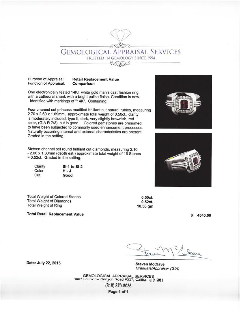 One electronically tested 14KT white gold man's cast fashion ring with a cathedral shank with a bright polish finish. Condition is new. Identified with markings of "14K". Containing: Four channel set princess modified brilliant cut natural rubies, measuring 2.70 x 2.60 x 1.69mm, approximate total weight of 0.50ct., clarity is moderately included, type II, dark, very slightly brownish, red color, (GIA R 7/3), cut is good. Colored gemstones are presumed to have been subjected to commonly used enhancement processes. Naturally occurring internal and external characteristics are present. Graded in the setting. Sixteen channel set round brilliant cut diamonds, measuring 2.10 - 2.00 x 1.30mm (depth est.) approximate total weight of 16 Stones = 0.52ct. Graded in the setting. Clarity: SI-1 to SI-2. Color: H - J. Cut: Good. Total Weight of Colored Stones: 0.50ct. Total Weight of Diamonds: 0.52ct. Total Weight of Ring: 10.50 gm. GAS Appraised at $4,540.00.