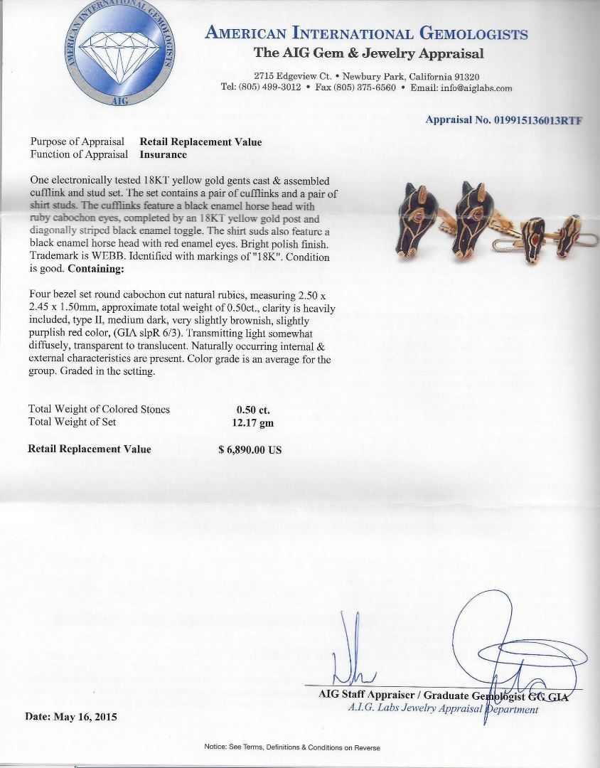 One electronically tested 18KT yellow gold gents cast & assembled cufflink and stud set. The set contains a pair of cufflinks and a pair of shirt studs. The cufflinks feature a black enamel horse head with ruby cabochon eyes, completed by an 18KT yellow gold post and diagonally striped black enamel toggle. The shirt studs also feature a black enamel horse head with red enamel eyes. Bright polish finish. Trademark is WEBB. Identified with markings of "18K". Condition is good. Containing: Four bezel set round cabochon cut natural rubies, measuring 2.50 x 2.45 x 1.50mm, approximate total weight of 0.50ct., clarity is heavily included, type II, medium dark, very slightly brownish, slightly purplish red color, (GIA slpR 6/3). Transmitting light somewhat diffusely, transparent to translucent. Naturally occurring internal & external characteristics are present. Color grade is an average for the group. Graded in the setting. Total Weight of Colored Stones: 0.50 ct. Total Weight of Set: 12.17 gm. AIG Appraised at $6,890.00.