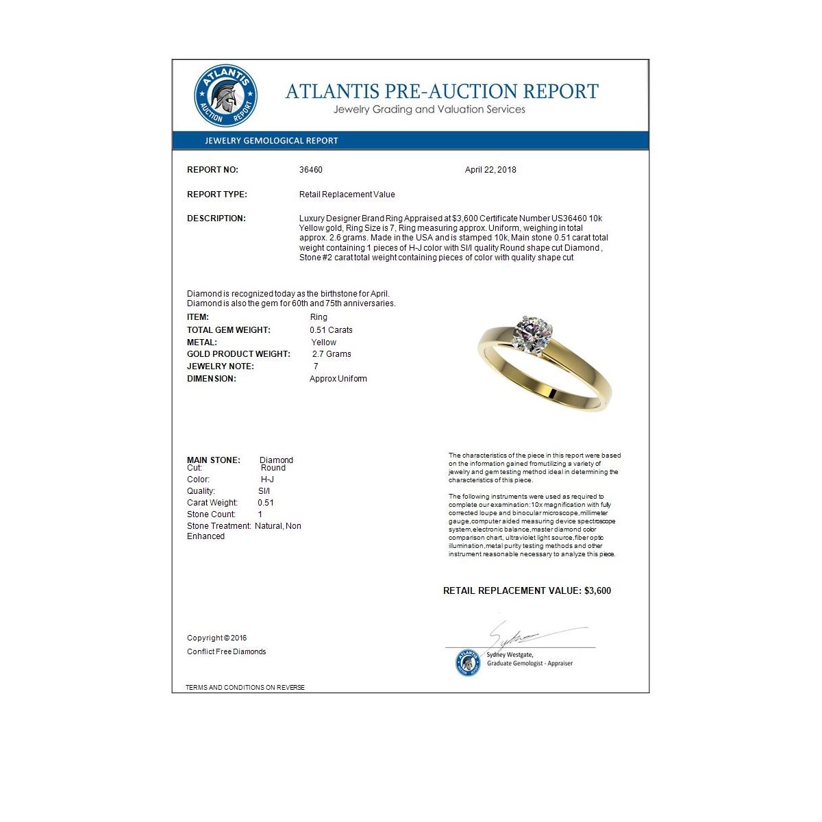 REF-54M2H -36460 ---- 0.51 CTW Certified H-SI/I Quality Diamond Solitaire Engagement Ring 10K Yellow Gold ---- Luxury Designer Brand Ring Appraised at $3,600 Certificate Number US36460 10k Yellow gold, Ring Size is 7, Ring measuring approx. Uniform, weighing in total approx. 2.6 grams. Made in the USA and is stamped 10k, Main stone 0.51 carat total weight containing 1 pieces of H-J color with SI/I quality Round shape cut Diamond , Stone #2 carat total weight containing pieces of color with quality shape cut