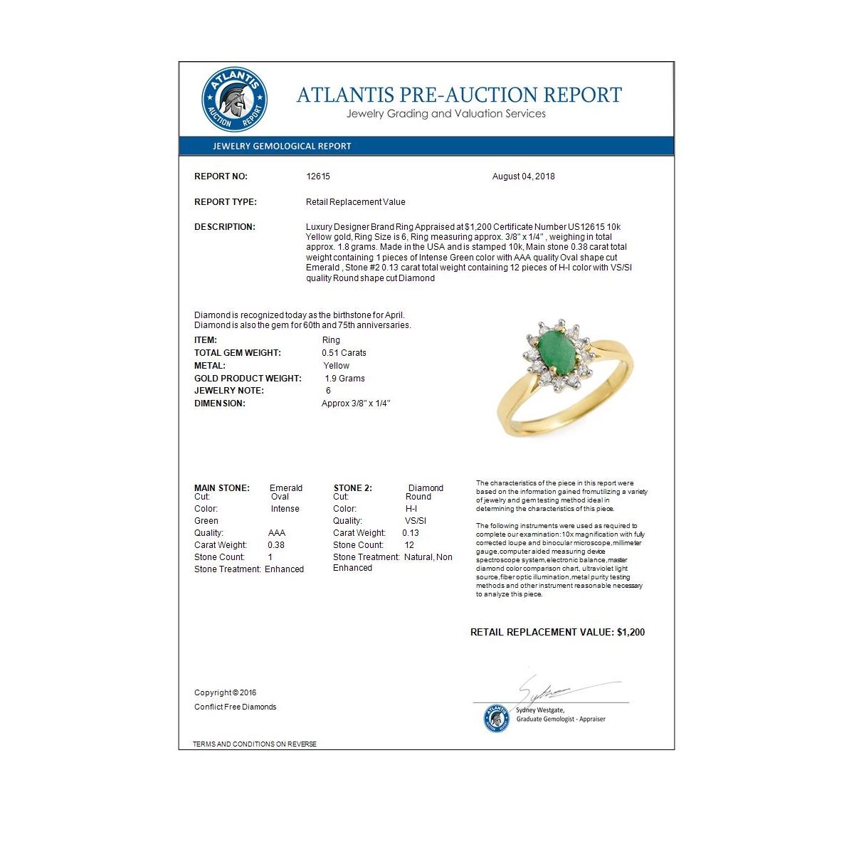 REF-18W2F -12615 ---- 0.51 CTW Emerald & Diamond Ring 10K Yellow Gold ---- Luxury Designer Brand Ring Appraised at $1,200 Certificate Number US12615 10k Yellow gold, Ring Size is 6, Ring measuring approx. 3/8" x 1/4" , weighing in total approx. 1.8 grams. Made in the USA and is stamped 10k, Main stone 0.38 carat total weight containing 1 pieces of Intense Green color with AAA quality Oval shape cut Emerald , Stone #2 0.13 carat total weight containing 12 pieces of H-I color with VS/SI quality Round shape cut Diamond