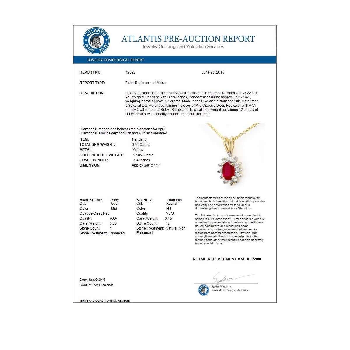 REF-13T3M -12622 ---- 0.51 CTW Ruby & Diamond Pendant 10K Yellow Gold ---- Luxury Designer Brand Pendant Appraised at $900 Certificate Number US12622 10k Yellow gold, Pendant Size is 1/4 Inches, Pendant measuring approx. 3/8" x 1/4" , weighing in total approx. 1.1 grams. Made in the USA and is stamped 10k, Main stone 0.36 carat total weight containing 1 pieces of Mid-Opaque-Deep Red color with AAA quality Oval shape cut Ruby , Stone #2 0.15 carat total weight containing 12 pieces of H-I color with VS/SI quality Round shape cut Diamond