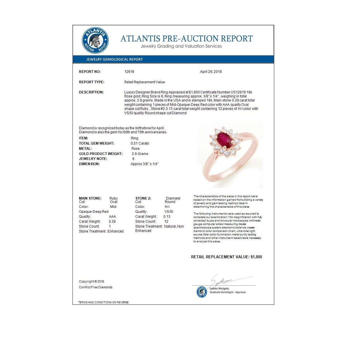 REF-27A3X -12619 ---- 0.51 CTW Ruby & Diamond Ring 18K Rose Gold ---- Luxury Designer Brand Ring Appraised at $1,800 Certificate Number US12619 18k Rose gold, Ring Size is 6, Ring measuring approx. 3/8" x 1/4" , weighing in total approx. 2.8 grams. Made in the USA and is stamped 18k, Main stone 0.38 carat total weight containing 1 pieces of Mid-Opaque-Deep Red color with AAA quality Oval shape cut Ruby , Stone #2 0.13 carat total weight containing 12 pieces of H-I color with VS/SI quality Round shape cut Diamond