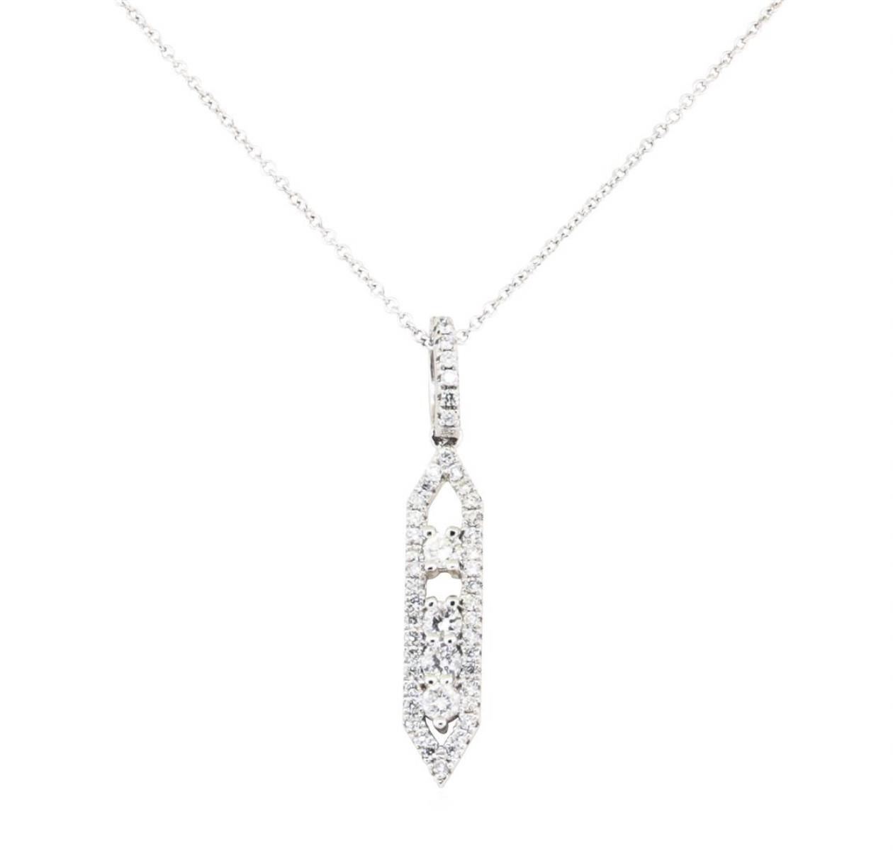 One icicle shaped pendant with an attached chain featuring: 14KT white gold weighing 2.6 grams containing diamonds weighing 0.51ctw. The chain is a 1mm rounded cable link chain measuring sixteen inches in length.