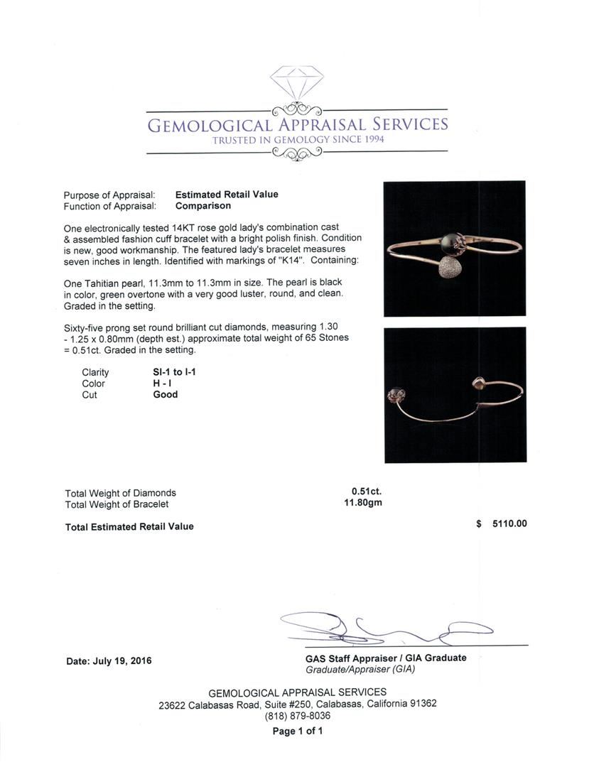 One electronically tested 14KT rose gold lady's combination cast & assembled fashion cuff bracelet with a bright polish finish. The featured lady's bracelet measures seven inches in length. Identified with markings of 'K14'. Condition is new, good workmanship. Containing: One Tahitian pearl, 11.3mm to 11.3mm in size. The pearl is black in color, green overtone with a very good luster, round, and clean. Graded in the setting. Sixty-Five prong set round brilliant cut diamonds, measuring 1.30 - 1.25 x 0.80mm (depth est.) approximate total weight of 65 Stones = 0.51ct. Graded in the setting. Clarity SI-1 to I-1. Color: H - I Cut Good. Total Weight of Diamonds 0.51ct.. Total Weight of Bracelet 11.80gm. GAS Appraised at $5,110.00.