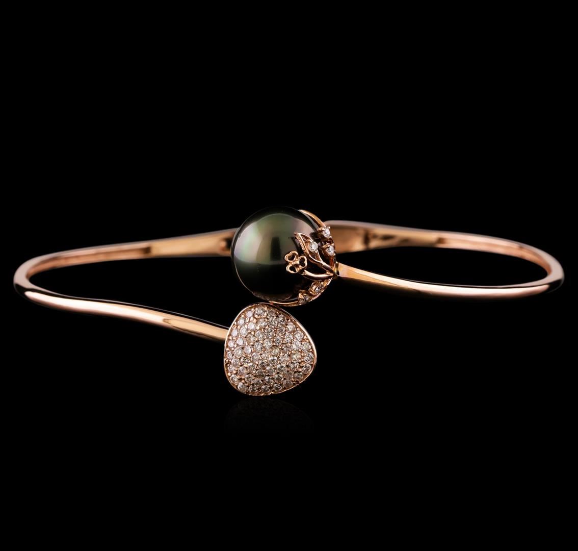 One electronically tested 14KT rose gold lady's combination cast & assembled fashion cuff bracelet with a bright polish finish. The featured lady's bracelet measures seven inches in length. Identified with markings of 'K14'. Condition is new, good workmanship. Containing: One Tahitian pearl, 11.3mm to 11.3mm in size. The pearl is black in color, green overtone with a very good luster, round, and clean. Graded in the setting. Sixty-Five prong set round brilliant cut diamonds, measuring 1.30 - 1.25 x 0.80mm (depth est.) approximate total weight of 65 Stones = 0.51ct. Graded in the setting. Clarity SI-1 to I-1. Color: H - I Cut Good. Total Weight of Diamonds 0.51ct.. Total Weight of Bracelet 11.80gm. GAS Appraised at $5,110.00.