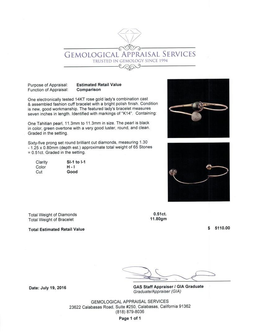 One electronically tested 14KT rose gold lady's combination cast & assembled fashion cuff bracelet with a bright polish finish. The featured lady's bracelet measures seven inches in length. Identified with markings of 'K14'. Condition is new, good workmanship. Containing: One Tahitian pearl, 11.3mm to 11.3mm in size. The pearl is black in color, green overtone with a very good luster, round, and clean. Graded in the setting. Sixty-Five prong set round brilliant cut diamonds, measuring 1.30 - 1.25 x 0.80mm (depth est.) approximate total weight of 65 Stones = 0.51ct. Graded in the setting. Clarity SI-1 to I-1. Color: H - I Cut Good. Total Weight of Diamonds 0.51ct.. Total Weight of Bracelet 11.80gm. GAS Appraised.