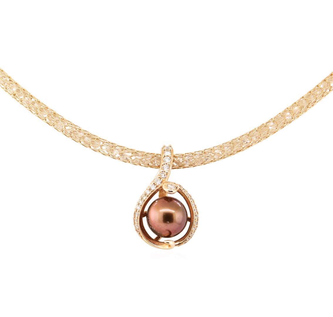 One electronically tested 14KT rose gold lady's combination cast & assembled fashion pendant & chain with a bright polish finish. The featured lady's pendant is attached to an eighteen inch long chain measuring 4 millimeters in diameter. The chain is a mesh tube filled with faceted crystals. Trademark is Na HoKu. Identified with markings of '14K'. Condition is like new, good workmanship. Containing: One Tahitian pearl, 10.0mm to 10.0mm in size. The pearl is chocolate in color with a very good luster, round, and clean. Colored gemstones are presumed to have been subjected to commonly used enhancement processes. Graded in the setting. One channel and prong set round brilliant cut diamond, measuring 2.50 - 2.45 x 1.54mm (depth est.) approximate weight of 0.06ct. Graded in the setting. Color H Clarity VS-2 Cut Very Good Twenty-Seven prong set round brilliant cut diamonds, measuring 2.00 - 1.30 x 1.02mm (depth est.) approximate total weight of 27 Stones = 0.45ct. Graded in the setting. Color G - H Clarity VS-2 to SI-1 Cut Very Good. Total Weight of Diamonds 0.51ct.. Total Weight of Pendant & Chain 23.70gm GAS Appraised at $4070.00. GAS Appraised at $4,070.00.