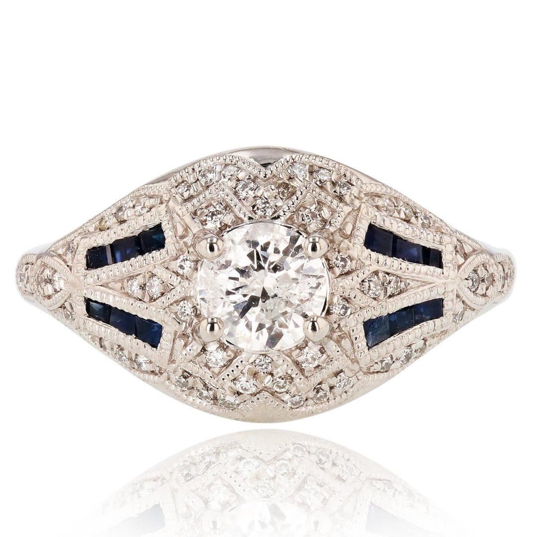 Platinum Diamond & Sapphire Ring One polished, stamped, and tested platinum ring with a bright finish. The ring is mounted with 1 genuine diamond center stone weighing approximately 0.51 carat, 12 genuine faceted sapphires weighing approximately 0.57 carats, and 50 genuine round diamonds weighing approximately 0.14 carats. This item weighs 6.7 grams, condition is new, excellent workmanship. MAIN GEMSTONE Identity: Natural Diamond Shape: Round Cutting Style: Brilliant Cut Average Diameter: 5.2mm Weight: 0.51 carat Color Grade: F Clarity Grade: I1 Polish: Excellent Symmetry: Very Good Refractive Index: 2.417 Hardness: 10 ADJACENT GEMSTONES ON RING Identity: Natural Diamond Shape: Round Cutting Style: Brilliant Cut Quantity: 50 Diamonds Average Diameter: 0.8mm Total Weight: 0.14 carats Color Grade: G - H Clarity Grade: SI2 Refractive Index: 2.418 Hardness: 10 ADJACENT GEMSTONES ON RING Species: Natural Corundum Variety: Sapphire Shape: Square Cutting Style: Step Cut Quantity: 12 Sapphires Measurements: 1.0 - 1.3mm Total Weight: 0.57 carats Color: Blue Refractive Index: 1.762 - 1.770 DR Birefringence: 0.008 - 0.010 Hardness: 9 CENTER DIAMOND WEIGHT: 0.51ct TOTAL SAPPHIRE WEIGHT: 0.57ctw TOTAL DIAMOND WEIGHT: 0.65ctw WEIGHT OF ITEM: 6.7 grams METAL: Platinum