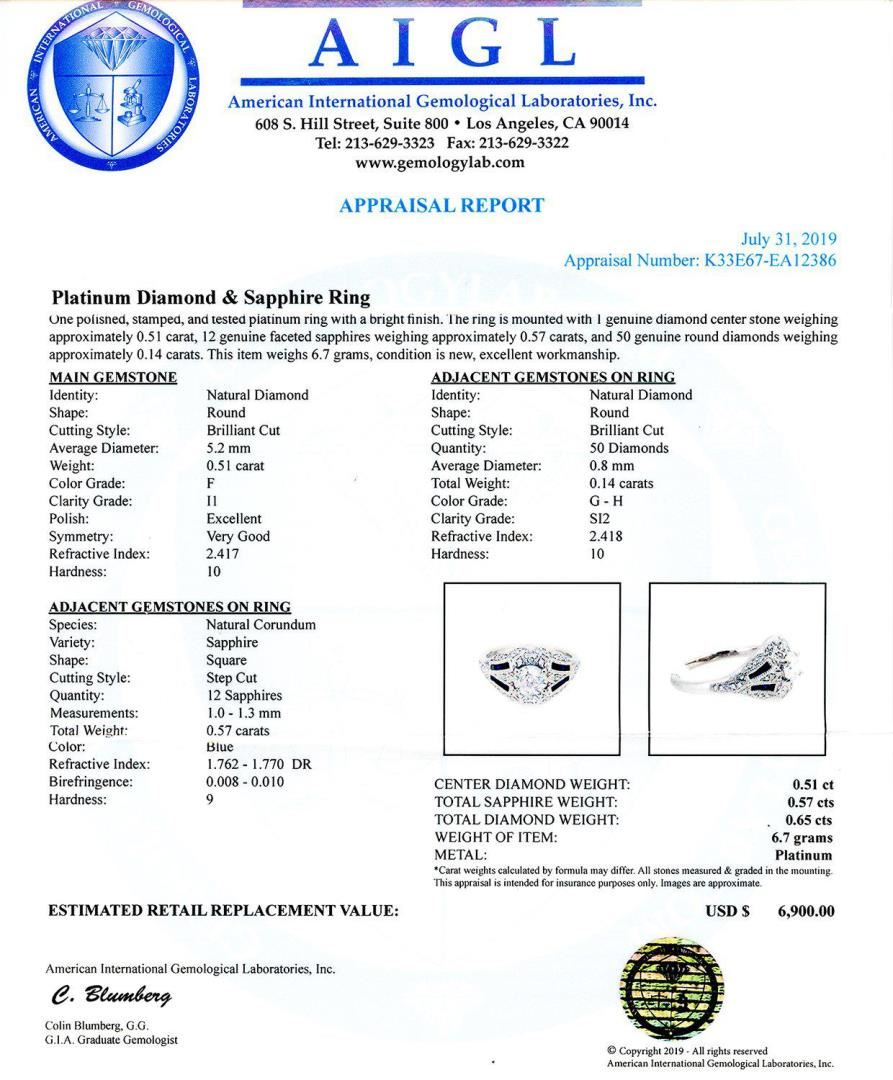 Platinum Diamond & Sapphire Ring One polished, stamped, and tested platinum ring with a bright finish. The ring is mounted with 1 genuine diamond center stone weighing approximately 0.51 carat, 12 genuine faceted sapphires weighing approximately 0.57 carats, and 50 genuine round diamonds weighing approximately 0.14 carats. This item weighs 6.7 grams, condition is new, excellent workmanship. MAIN GEMSTONE Identity: Natural Diamond Shape: Round Cutting Style: Brilliant Cut Average Diameter: 5.2mm Weight: 0.51 carat Color Grade: F Clarity Grade: I1 Polish: Excellent Symmetry: Very Good Refractive Index: 2.417 Hardness: 10 ADJACENT GEMSTONES ON RING Identity: Natural Diamond Shape: Round Cutting Style: Brilliant Cut Quantity: 50 Diamonds Average Diameter: 0.8mm Total Weight: 0.14 carats Color Grade: G - H Clarity Grade: SI2 Refractive Index: 2.418 Hardness: 10 ADJACENT GEMSTONES ON RING Species: Natural Corundum Variety: Sapphire Shape: Square Cutting Style: Step Cut Quantity: 12 Sapphires Measurements: 1.0 - 1.3mm Total Weight: 0.57 carats Color: Blue Refractive Index: 1.762 - 1.770 DR Birefringence: 0.008 - 0.010 Hardness: 9 CENTER DIAMOND WEIGHT: 0.51ct TOTAL SAPPHIRE WEIGHT: 0.57ctw TOTAL DIAMOND WEIGHT: 0.65ctw WEIGHT OF ITEM: 6.7 grams METAL: Platinum #Size: 6 1/2