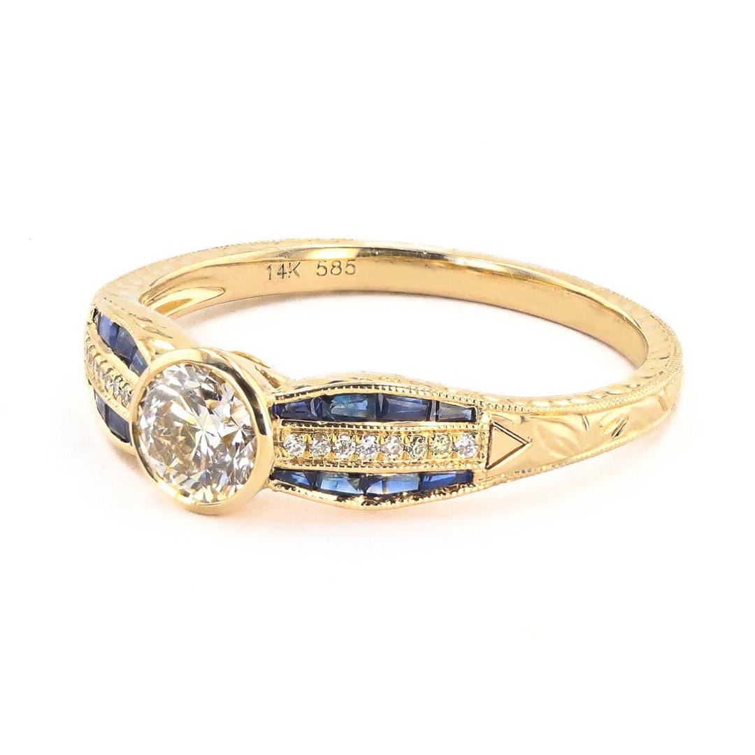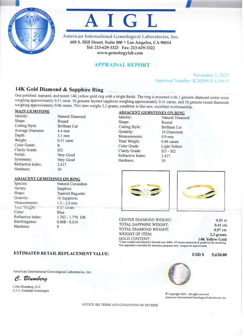 One polished, stamped. and tested 14K yellow gold ring with a bright finish. The ring is mounted with 1 genuine diamond center stone weighing approximately 0.51 carat, 16 genuine faceted sapphires weighing approximately 0.41 carats, and 16 genuine round diamonds weighing approximately 0.06 carats. This item weighs 2.3 grams, condition is like new, excellent workmanship. #MAIN GEMSTONE# Identity: Natural Diamond Shape: Round Cutting Style: Brilliant Cut Average Diameter: 4.4mm Depth: 3.1mm Weight: 0.51 carat Color Grade: K Clarity Grade: SI2 Polish: Very Good Symmetry: Very Good Refractive Index: 2.417 Hardness: 10 #ADJACENT GEMSTONES ON RING# Species: Natural Corundum Variety: Sapphire Shape: Tapered Baguette Quantity: 16 Sapphires Measurements: 1.5 - 2.0mm Total Weight: 0.41 carats Color: Blue Refractive Index: 1.762 - 1.770 DR Birefringence: 0.008 - 0.010 Hardness: 9 #ADJACENT GEMSTONES ON RING# Identity: Natural Diamond Shape: Round Cutting Style: Brilliant Cut Quantity: 16 Diamonds Measurements: 0.9mm Total Weight: 0.06 carats Color Grade: Light Yellow Clarity Grade: SI1-SI2 Refractive Index: 2.417 Hardness: 10 CENTER DIAMOND WEIGHT: 0.51 ct TOTAL SAPPHIRE WEIGHT: 0.41 cts TOTAL DIAMOND WEIGHT: 0.57 cts WEIGHT OF ITEM: 2.3 grams GOLD CONTENT: 14K Yellow Gold Size: 6 3/4