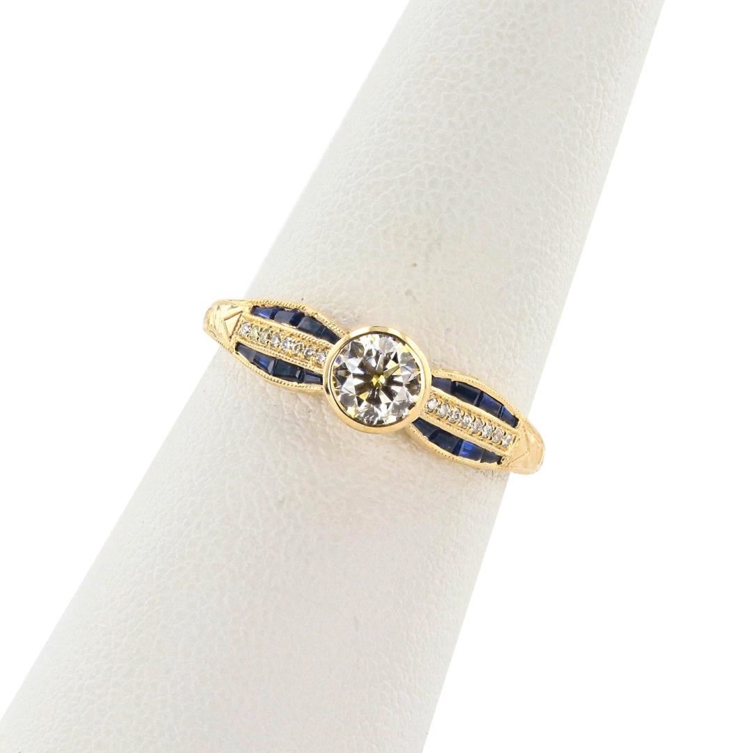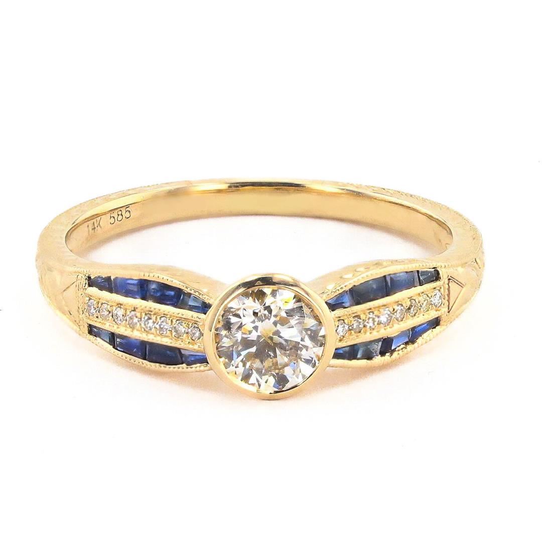 One polished, stamped. and tested 14K yellow gold ring with a bright finish. The ring is mounted with 1 genuine diamond center stone weighing approximately 0.51 carat, 16 genuine faceted sapphires weighing approximately 0.41 carats, and 16 genuine round diamonds weighing approximately 0.06 carats. This item weighs 2.3 grams, condition is like new, excellent workmanship. #MAIN GEMSTONE# Identity: Natural Diamond; Shape: Round; Cutting Style: Brilliant Cut; Average Diameter: 4.4mm; Depth: 3.1mm; Weight: 0.51 carat; Color Grade: K; Clarity Grade: SI2; Polish: Very Good; Symmetry: Very Good; Refractive Index: 2.417; Hardness: 10 #ADJACENT GEMSTONES ON RING# Species: Natural Corundum; Variety: Sapphire; Shape: Tapered Baguette; Quantity: 16 Sapphires; Measurements: 1.5 - 2.0mm; Total Weight: 0.41 carats; Color: Blue; Refractive Index: 1.762 - 1.770 DR; Birefringence: 0.008 - 0.010; Hardness: 9 #ADJACENT GEMSTONES ON RING# Identity: Natural Diamond; Shape: Round; Cutting Style: Brilliant Cut; Quantity: 16 Diamonds; Measurements: 0.9mm; Total Weight: 0.06 carats; Color Grade: Light Yellow; Clarity Grade: SI1-SI2; Refractive Index: 2.417; Hardness: 10; CENTER DIAMOND WEIGHT: 0.51 ct; TOTAL SAPPHIRE WEIGHT: 0.41 cts; TOTAL DIAMOND WEIGHT: 0.57 cts; WEIGHT OF ITEM: 2.3 grams; GOLD CONTENT: 14K Yellow Gold #Size: 6 3/4