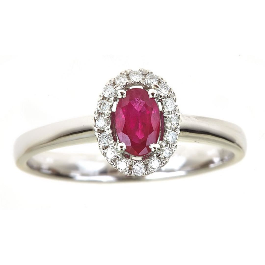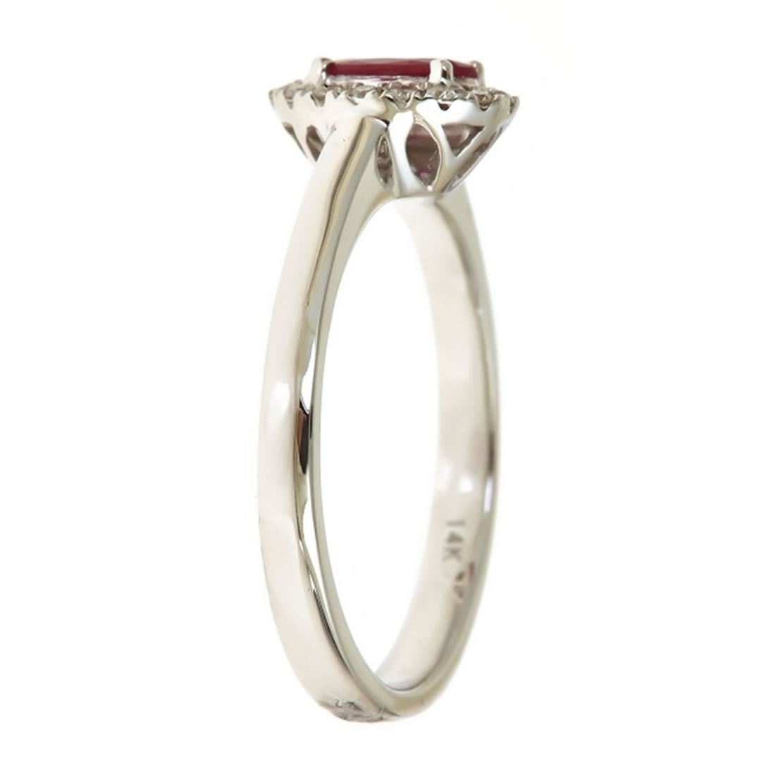 One Ruby and Diamond Ring featuring: 14KT White Gold with a total weight of 2.54 grams, Ruby with a total weight of 0.51ct, and 16 Round Cut Diamonds with a total weight of 0.10ctw.