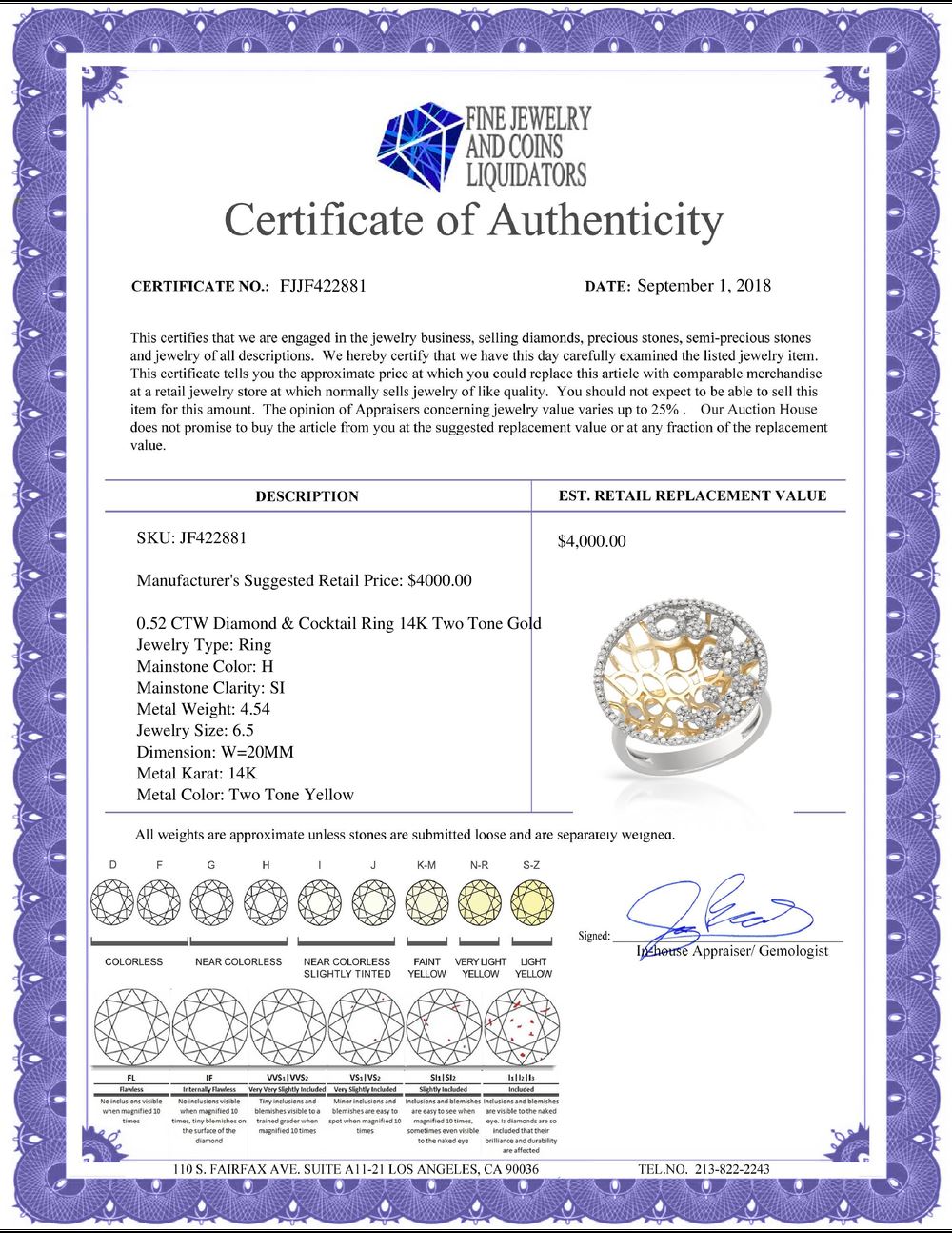 All sales are final, no lots are sold on approval; placing a bid is a legally binding obligation. There are no returns or exchanges. All lots are sold as is, where is, with all the faults, imperfections, omissions and errors in the written description, estimates, appraisals, graphics and photography. WJA is not responsible for any errors or omissions in the description, graphics or photography provided or in the bidding software. Due diligence to verify the condition and description of a lot is the sole responsibility of the Bidder prior to placing any bid. Returns may only be made with the advance written authorization of WJA and are in WJA’s sole discretion to approve. To request a return you must provide a written request fully explaining the basis for the return no later than 4 days after your receipt of the lot. Under no circumstances will any amounts other than the winning bid amount be refunded. A restocking charge of 20% of the full invoice amount may apply in WJA 's sole discretion. Any allowed returns must be received in exactly the same condition as when originally shipped to Buyer, or they will be returned to buyer at Buyer’s cost. Any unauthorized returns will be refused. DELIVERY REFUSAL OF ITEMS SHIPPED BY WORLD JEWELRY AUCTION TO THE BIDDER CONSTITUTES AN UNAUTHORIZED RETURN IN DIRECT VIOLATION OF THESE GENERAL TERMS AND CONDITIONS.
