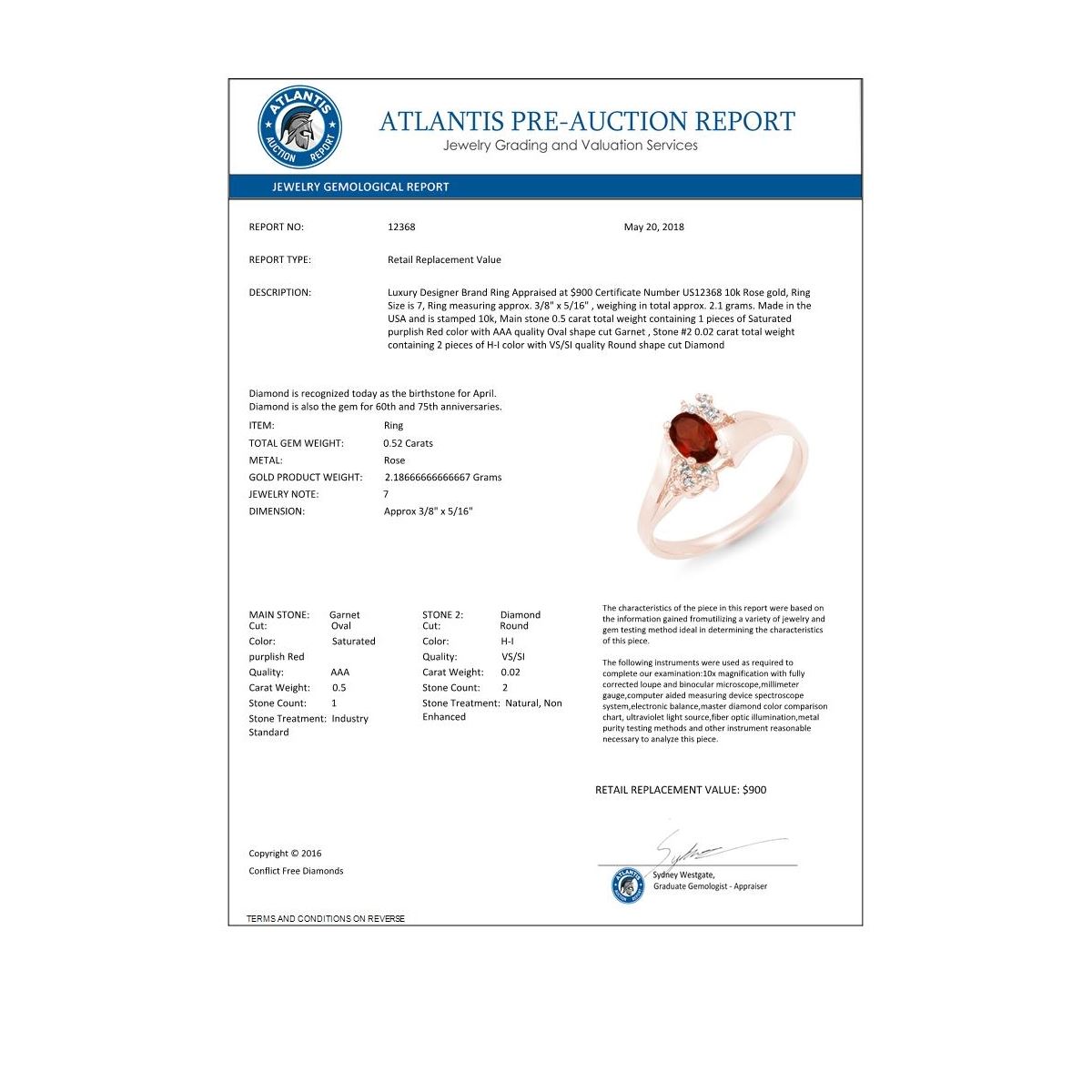 REF-14X8T -12368 ---- 0.52 CTW Garnet & Diamond Ring 10K Rose Gold ---- Luxury Designer Brand Ring Appraised at $900 Certificate Number US12368 10k Rose gold, Ring Size is 7, Ring measuring approx. 3/8" x 5/16" , weighing in total approx. 2.1 grams. Made in the USA and is stamped 10k, Main stone 0.5 carat total weight containing 1 pieces of Saturated purplish Red color with AAA quality Oval shape cut Garnet , Stone #2 0.02 carat total weight containing 2 pieces of H-I color with VS/SI quality Round shape cut Diamond