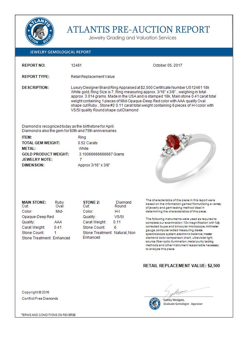 12461 - REF-38H2M ---- 0.52 CTW Ruby & Diamond Ring 18K White Gold ---- Luxury Designer Brand Ring Appraised at $2,500 Certificate Number US12461 18k White gold, Ring Size is 7, Ring measuring approx. 3/16" x 3/8" , weighing in total approx. 3.014 grams. Made in the USA and is stamped 18k, Main stone 0.41 carat total weight containing 1 pieces of Mid-Opaque-Deep Red color with AAA quality Oval shape cut Ruby , Stone #2 0.11 carat total weight containing 6 pieces of H-I color with VS/SI quality Round shape cut Diamond