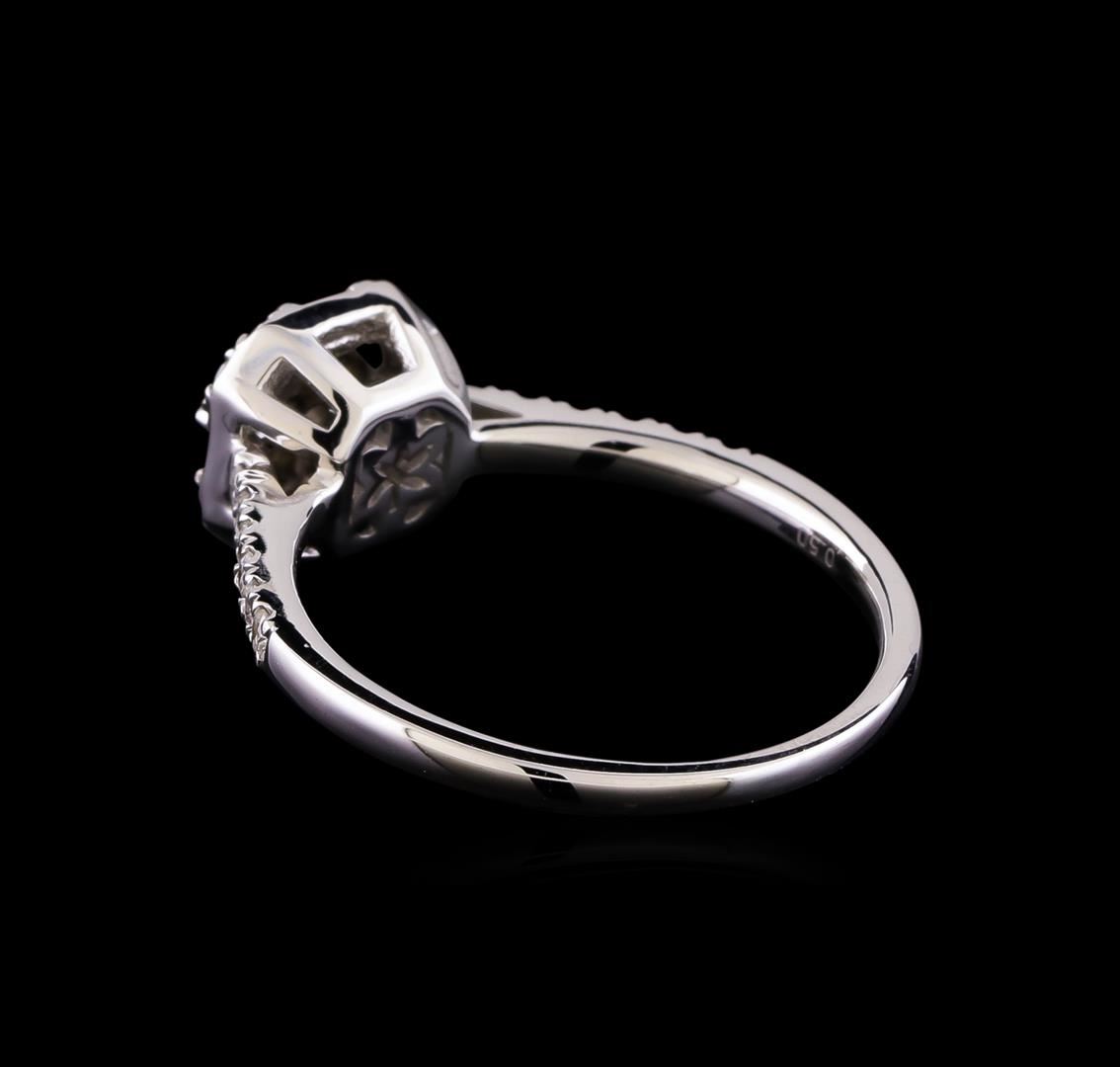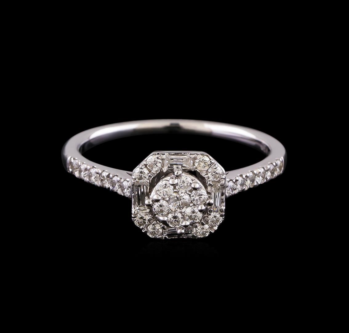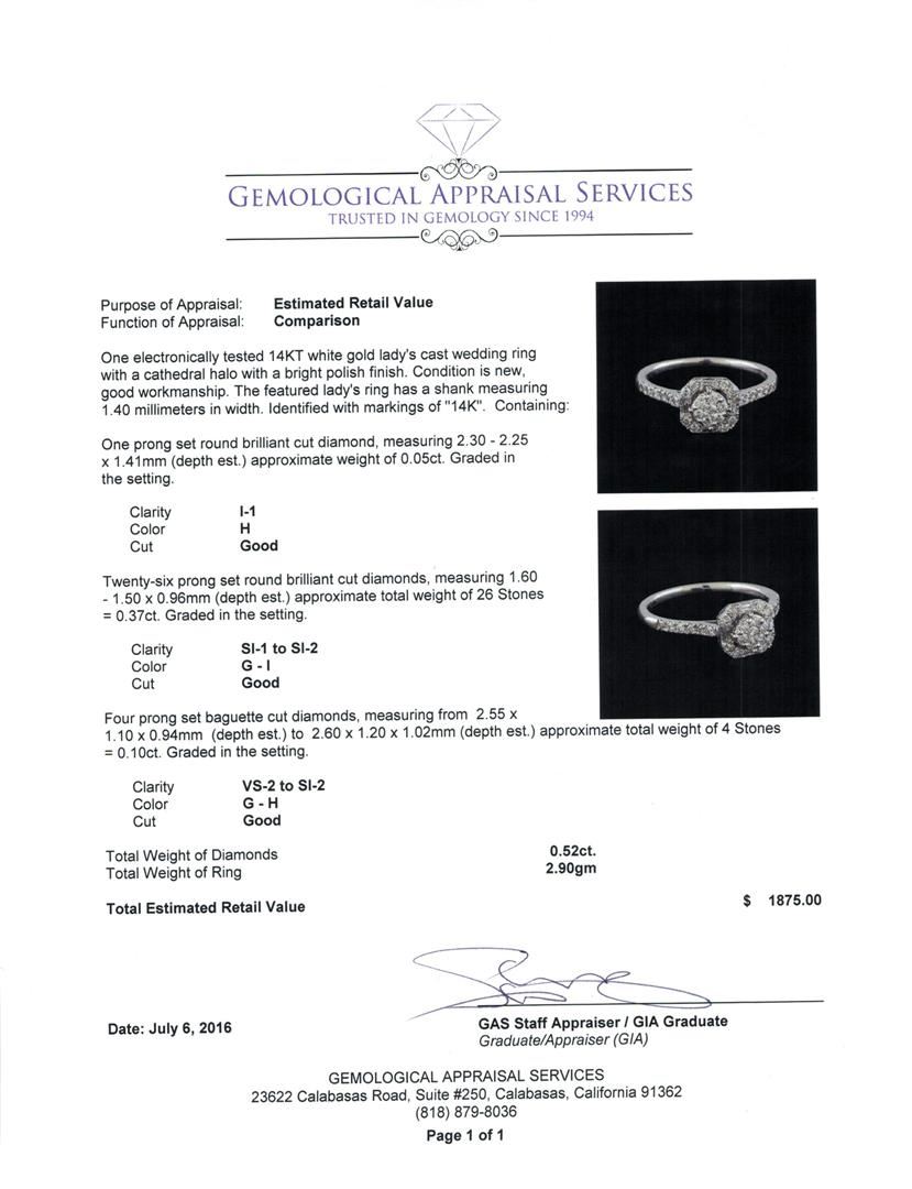 One electronically tested 14KT white gold lady's cast wedding ring with a cathedral halo with a bright polish finish. The featured lady's ring has a shank measuring 1.40 millimeters in width. Identified with markings of '14K'. Condition is new, good workmanship. Containing: One prong set round brilliant cut diamond, measuring 2.30 - 2.25 x 1.41mm (depth est.) approximate weight of 0.05ct. Graded in the setting. Clarity I-1. Color: H Cut Good Twenty-Six prong set round brilliant cut diamonds, measuring 1.60 - 1.50 x 0.96mm (depth est.) approximate total weight of 26 Stones = 0.37ct. Graded in the setting. Clarity SI-1 to SI-2. Color: G - I Cut Good Four prong set baguette cut diamonds, measuring from 2.55 x 1.10 x 0.94mm (depth est.) to 2.60 x 1.20 x 1.02mm (depth est.) approximate total weight of 4 Stones = 0.10ct. Graded in the setting. Clarity VS-2 to SI-2. Color: G - H Cut Good. Total Weight of Diamonds 0.52ct.. Total Weight of Ring 2.90gm. GAS Appraised at $1,875.00.
