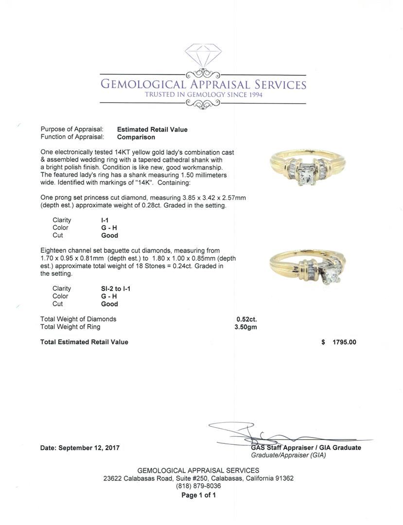 One electronically tested 14KT yellow gold lady's combination cast & assembled wedding ring with a tapered cathedral shank with a bright polish finish. The featured lady's ring has a shank measuring 1.50 millimeters wide. Identified with markings of '14K'. Condition is like new, good workmanship. Containing: One prong set princess cut diamond, measuring 3.85 x 3.42 x 2.57mm (depth est.) approximate weight of 0.28ct. Graded in the setting. Color G - H Clarity I-1 Cut Good Eighteen channel set baguette cut diamonds, measuring from 1.70 x 0.95 x 0.81mm (depth est.) to 1.80 x 1.00 x 0.85mm (depth est.) approximate total weight of 18 Stones = 0.24ct. Graded in the setting. Color G - H Clarity SI-2 to I-1 Cut Good. Total Weight of Diamonds 0.52ct.. Total Weight of Ring 3.50gm GAS Appraised at $1795.00. GAS Appraised at $1,795.00.