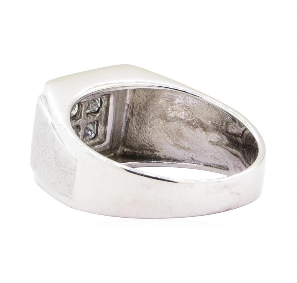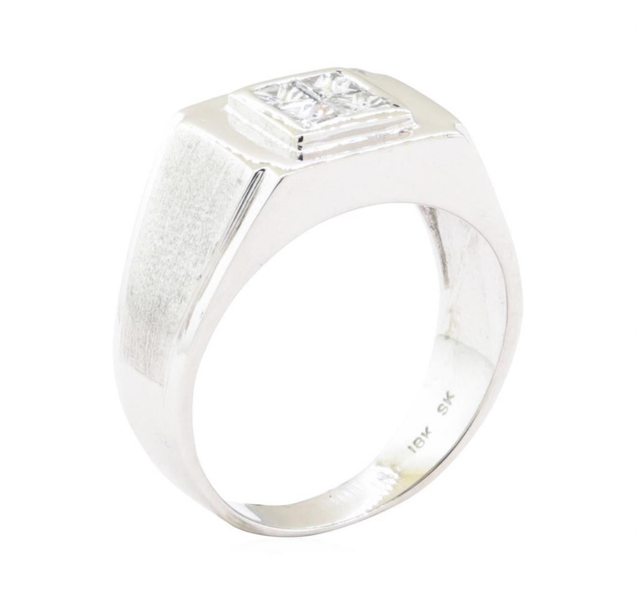 One electronically tested 18KT white gold man's cast fashion ring with a square top with a bright polish finish. The featured man's ring has a shank measuring 3.60 millimeters wide. Identified with markings of '18K'. Condition is Good. Containing: Four invisible set princess cut diamonds, measuring 2.80 x 2.75 x 2.07mm (depth est.) approximate total weight of 4 Stones = 0.52ct. Graded in the setting. Color H - I Clarity VS-1 to SI-1 Cut Very Good. Total Weight of Diamonds 0.52ct.. Total Weight of Ring 7.30gm GAS Appraised at $2775.00. GAS Appraised at $5,110.00.
