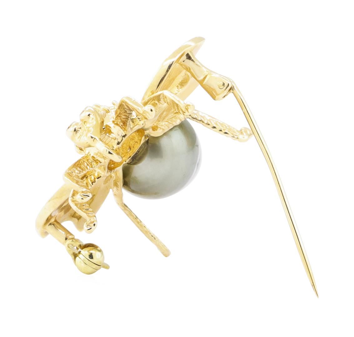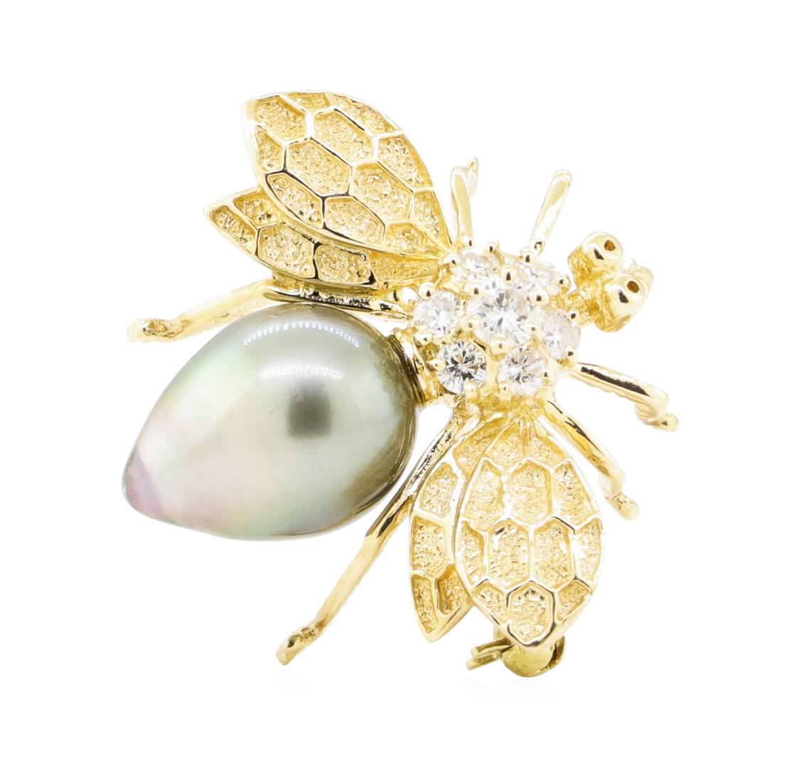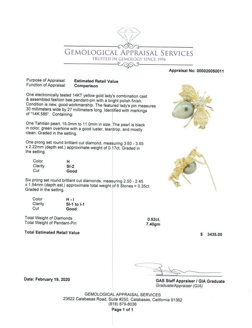 One electronically tested 14KT yellow gold lady's combination cast & assembled fashion bee pendant-pin with a bright polish finish. The featured lady's pin measures 30 millimeters wide by 27 millimeters long. Identified with markings of '14K 585'. Condition is new, good workmanship. Containing: One Tahitian pearl, 15.0mm to 11.0mm in size. The pearl is black in color, green overtone with a good luster, teardrop, and mostly clean. Graded in the setting. One prong set round brilliant cut diamond, measuring 3.60 - 3.55 x 2.22mm (depth est.) approximate weight of 0.17ct. Graded in the setting. Color H Clarity SI-2 Cut Good Six prong set round brilliant cut diamonds, measuring 2.50 - 2.45 x 1.54mm (depth est.) approximate total weight of 6 Stones = 0.35ct. Graded in the setting. Color H - I Clarity SI-1 to I-1 Cut Good. Total Weight of Diamonds 0.52ct.. Total Weight of Pendant-Pin 7.40gm GAS Appraised at $3435.00. GAS Appraised at $3,435.00.