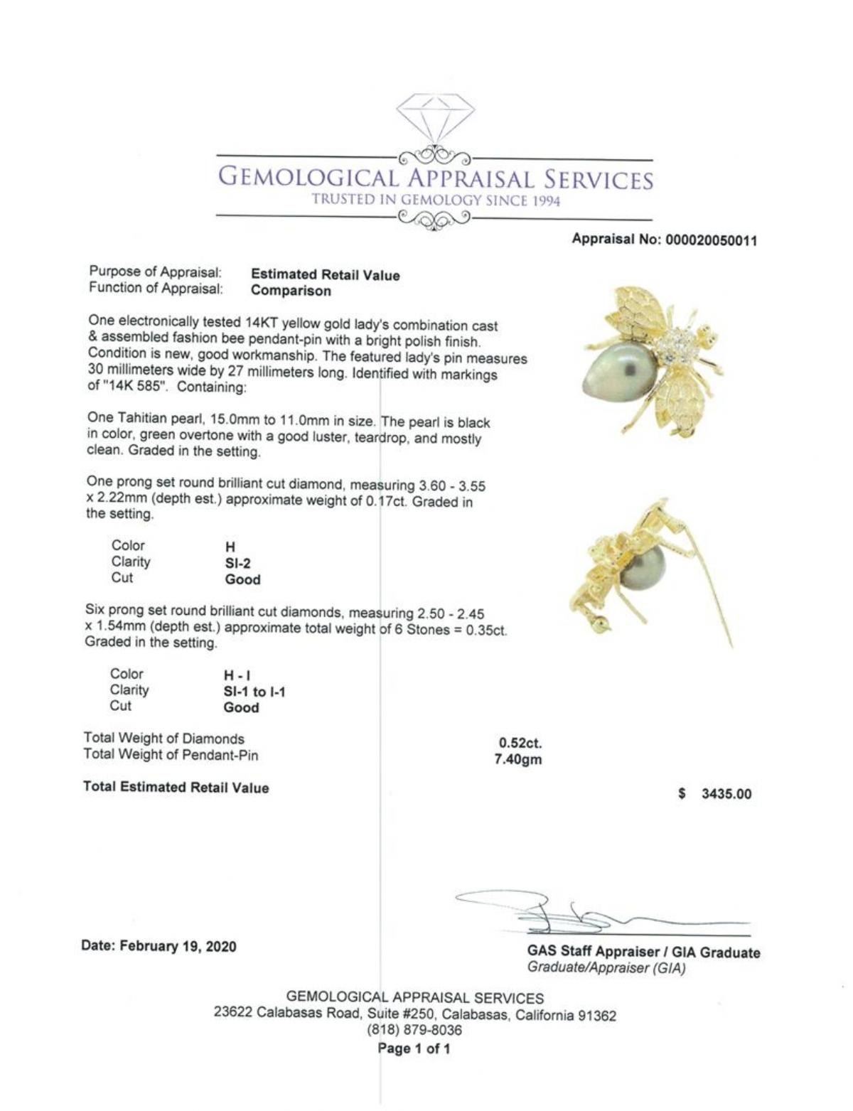One electronically tested 14KT yellow gold lady's combination cast & assembled fashion bee pendant-pin with a bright polish finish. The featured lady's pin measures 30 millimeters wide by 27 millimeters long. Identified with markings of '14K 585'. Condition is new, good workmanship. Containing: One Tahitian pearl, 15.0mm to 11.0mm in size. The pearl is black in color, green overtone with a good luster, teardrop, and mostly clean. Graded in the setting. One prong set round brilliant cut diamond, measuring 3.60 - 3.55 x 2.22mm (depth est.) approximate weight of 0.17ct. Graded in the setting. Color H Clarity SI-2 Cut Good Six prong set round brilliant cut diamonds, measuring 2.50 - 2.45 x 1.54mm (depth est.) approximate total weight of 6 Stones = 0.35ct. Graded in the setting. Color H - I Clarity SI-1 to I-1 Cut Good. Total Weight of Diamonds 0.52ct.. Total Weight of Pendant-Pin 7.40gm GAS Appraised at $3435.00. GAS Appraised at $3,435.00.