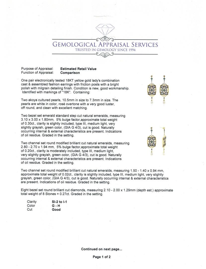 One pair electronically tested 18KT yellow gold lady's combination cast & assembled fashion earrings with friction posts with a bright polish with milgrain detailing finish. Identified with markings of "18K". Condition is new, good workmanship. Containing: Two akoya cultured pearls, 10.5mm in size to 7.3mm in size. The pearls are white in color, rosé overtone with a very good luster, off round, and clean with excellent matching. Two bezel set emerald standard step cut natural emeralds, measuring 3.10 x 3.00 x 1.80mm, 5%. bulge factor, approximate total weight of 0.30ct., clarity is slightly included, type III, medium light, very slightly grayish, green color, (GIA G 4/3), cut is good. Naturally occurring internal & external characteristics are present. Indications of oil residue. Graded in the setting. Two channel set round modified brilliant cut natural emeralds, measuring 2.80 - 2.70 x 1.94 mm, 5%. bulge factor, approximate total weight of 0.20ct., clarity is moderately included, type III, medium light, very slightly grayish, green color, (GIA G 4/3), cut is good. Naturally occurring internal & external characteristics are present. Indications of oil residue. Graded in the setting. Two channel set round modified brilliant cut natural emeralds, measuring 1.50 - 1.40 x 0.94 mm, approximate total weight of 0.02ct., clarity is slightly included, type III, medium light, very slightly grayish, green color, (GIA G 4/3), cut is good. Naturally occurring internal & external characteristics are present. Indications of oil residue. Graded in the setting. Eight bezel set round brilliant cut diamonds, measuring 2.10 - 2.00 x 1.29mm (depth est.) approximate total weight of 8 Stones = 0.27ct. Graded in the setting. Clarity: SI-2 to I-1. Color: G - H. Cut Good One Hundred Fifty-Six prong set single cut diamonds, measuring 1.20 - 1.00 x 0.66mm (depth est.) approximate total weight of 156 Stones = 0.73ct. Graded in the setting. Clarity: SI-1 to I-1. Color: H - I. Cut Good. Total Weight of Colored Stones 0.52ct. Total Weight of Diamonds 1.00ct. Total Weight of Earrings 17.30gm. GAS Appraised at $7,460.00.