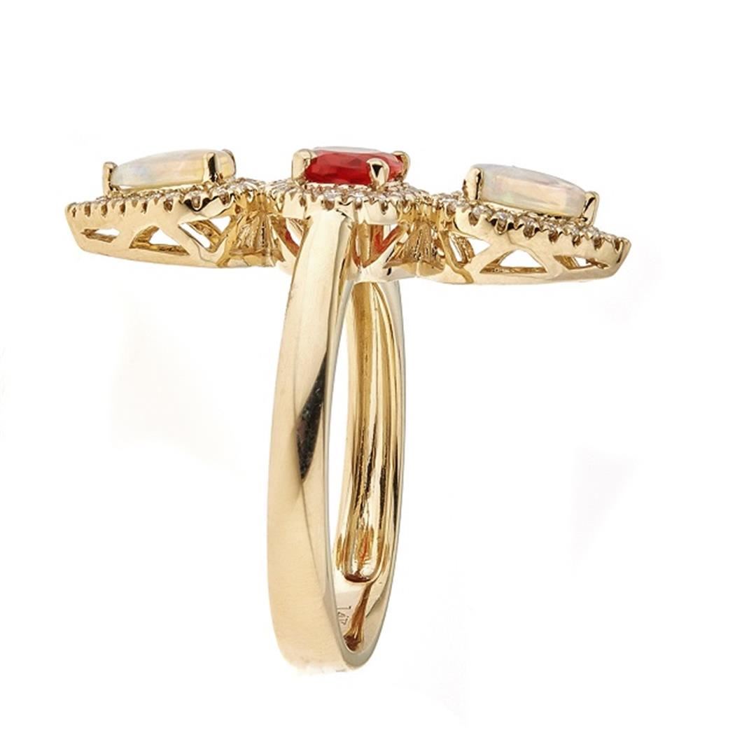 One Fire Opal, Australian Opal, and Diamond Ring featuring: 14KT Yellow Gold with a total weight of 4.55 grams, Fire Opal with a total weight of 0.52ctw, 2 Australian Opal Stones with a total weight of 0.46ctw, and 60 Round Cut Diamonds with a total weight of 0.22ctw.