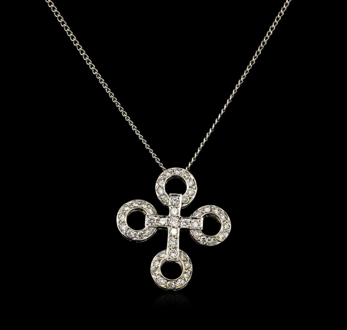 One electronically tested 18KT-platinum white gold lady's cast cross pendant & chain 20.0" long, 1mm flat cable link with a lobster claw clasp with a bright polish finish. The featured lady's pendant is cast in 18K white gold with an attached platinum chain. Identified with markings of "PT 950". Condition is new, good workmanship. Containing: Forty-Six bead set round brilliant cut diamonds, measuring 1.50 - 1.40 x 0.88mm (depth est.) approximate total weight of 46 Stones = 0.52ct. Graded in the setting. Clarity: VS-2 to SI-1. Color: G - Very Good. Total Weight of Diamonds 0.52ct. Total Weight of Pendant & Chain 5.60gm. GAS Appraised at $3,030.00.