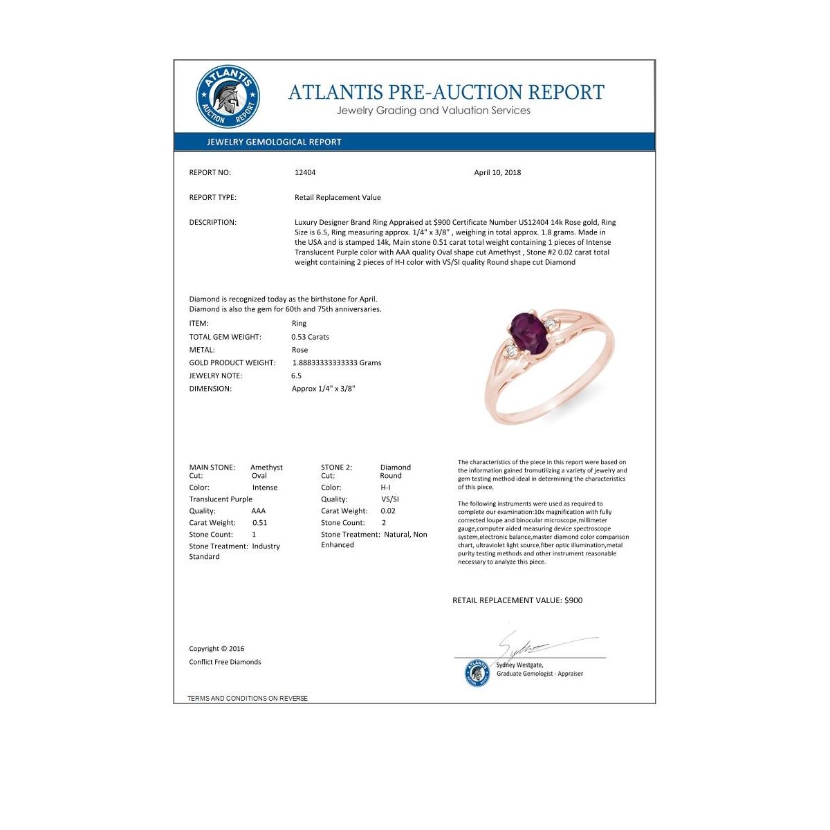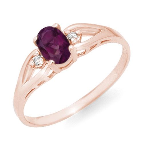 REF-14A2X -12404 ---- 0.53 CTW Amethyst & Diamond Ring 14K Rose Gold ---- Luxury Designer Brand Ring Appraised at $900 Certificate Number US12404 14k Rose gold, Ring Size is 6.5, Ring measuring approx. 1/4" x 3/8" , weighing in total approx. 1.8 grams. Made in the USA and is stamped 14k, Main stone 0.51 carat total weight containing 1 pieces of Intense Translucent Purple color with AAA quality Oval shape cut Amethyst , Stone #2 0.02 carat total weight containing 2 pieces of H-I color with VS/SI quality Round shape cut Diamond