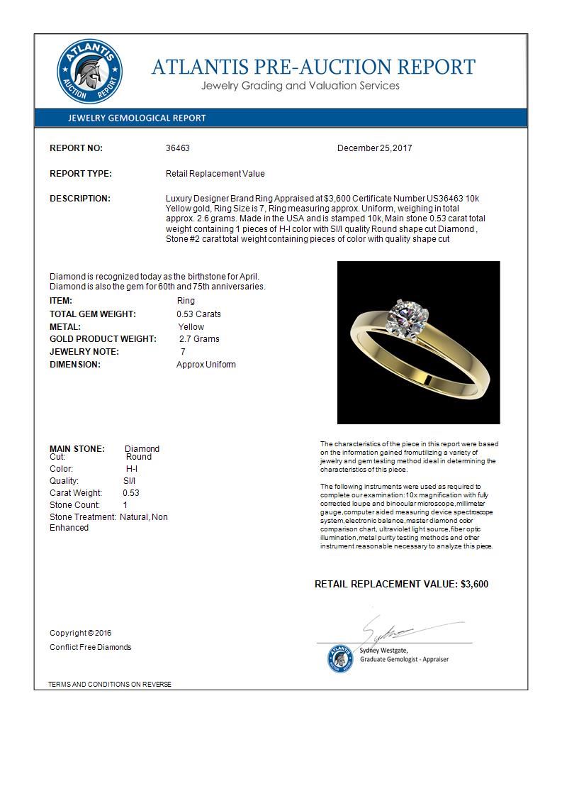 REF-54M2H -36463 ---- 0.53 CTW Certified H-SI/I Quality Diamond Solitaire Engagement Ring 10K Yellow Gold ---- Luxury Designer Brand Ring Appraised at $3,600 Certificate Number US36463 10k Yellow gold, Ring Size is 7, Ring measuring approx. Uniform, weighing in total approx. 2.6 grams. Made in the USA and is stamped 10k, Main stone 0.53 carat total weight containing 1 pieces of H-I color with SI/I quality Round shape cut Diamond , Stone #2 carat total weight containing pieces of color with quality shape cut