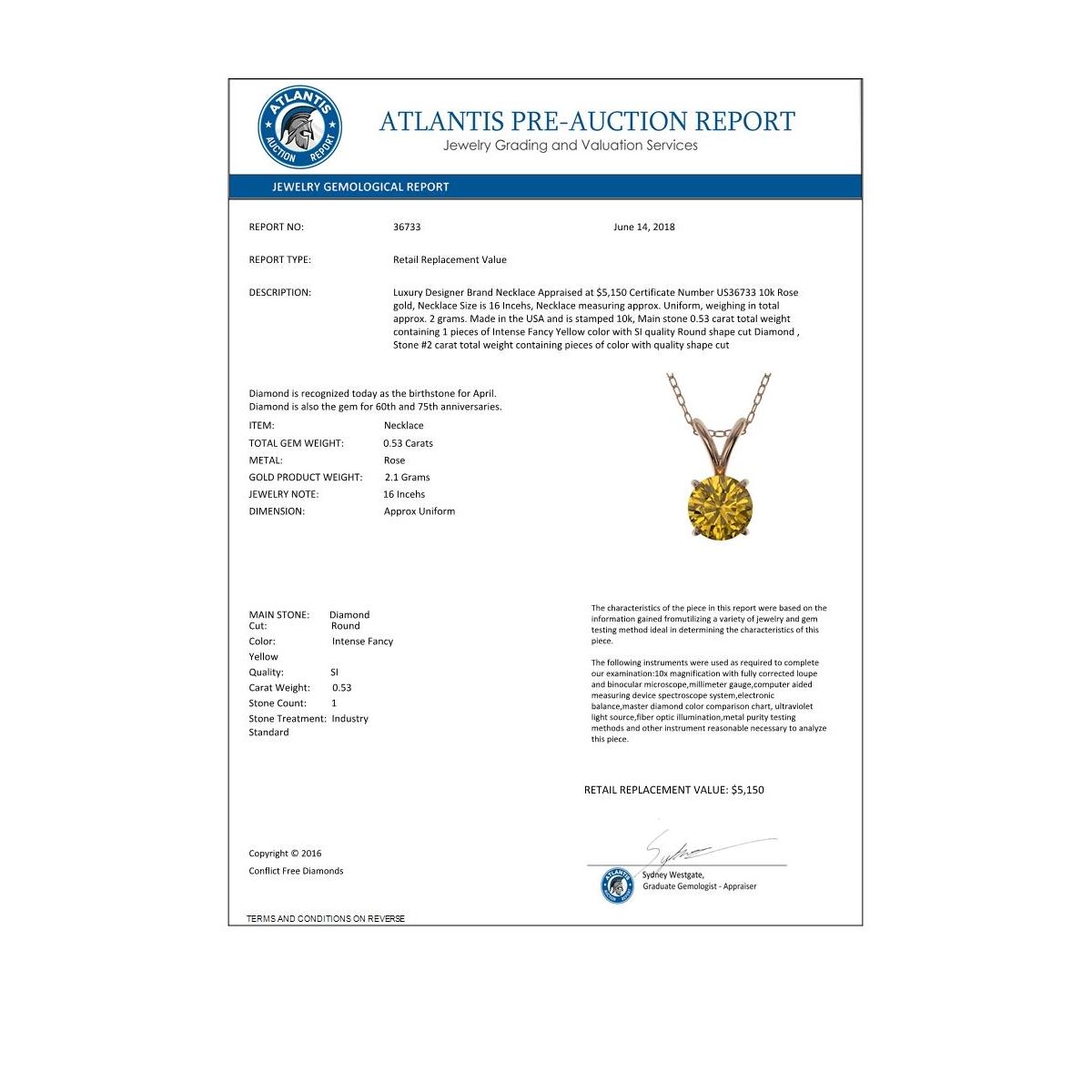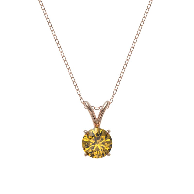 REF-70H5A -36733 ---- 0.53 CTW Certified Intense Yellow SI Diamond Solitaire Necklace 10K Rose Gold ---- Luxury Designer Brand Necklace Appraised at $5,150 Certificate Number US36733 10k Rose gold, Necklace Size is 16 Incehs, Necklace measuring approx. Uniform, weighing in total approx. 2 grams. Made in the USA and is stamped 10k, Main stone 0.53 carat total weight containing 1 pieces of Intense Fancy Yellow color with SI quality Round shape cut Diamond , Stone #2 carat total weight containing pieces of color with quality shape cut