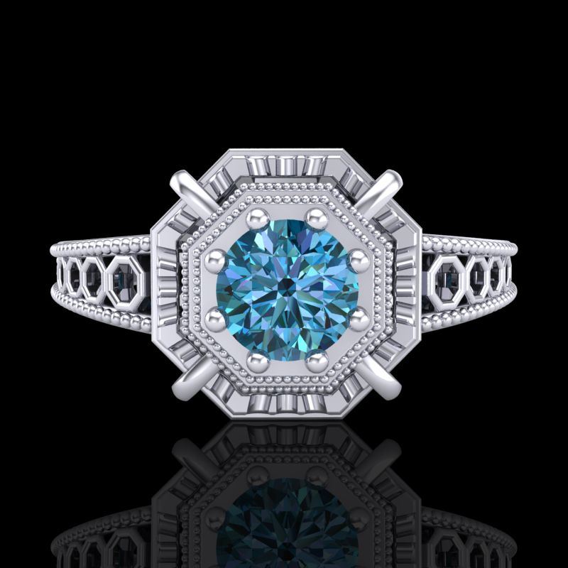REF-109M3H -37439 ---- 0.53 CTW Fancy Intense Blue Diamond Solitaire Art Deco Ring 18K White Gold ---- Luxury Designer Brand Ring Appraised at $7,200 Certificate Number US37439 18k White gold, Ring Size is 7, Ring measuring approx. Uniform, weighing in total approx. 6 grams. Made in the USA and is stamped 18k, Main stone 0.53 carat total weight containing 1 pieces of Intense Fancy Blue color with SI quality Round shape cut Diamond , Stone #2 carat total weight containing pieces of color with quality shape cut