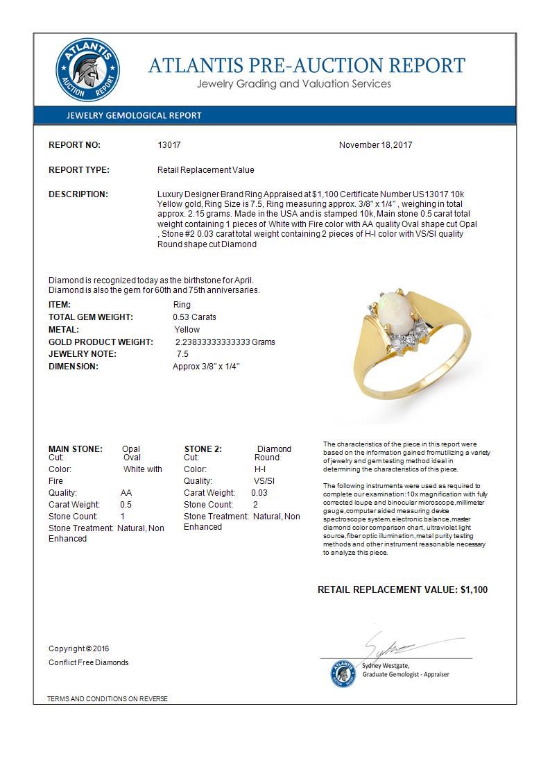 REF-16K5W -13017 ---- 0.53 CTW Opal & Diamond Ring 10K Yellow Gold ---- Luxury Designer Brand Ring Appraised at $1,100 Certificate Number US13017 10k Yellow gold, Ring Size is 7.5, Ring measuring approx. 3/8" x 1/4" , weighing in total approx. 2.15 grams. Made in the USA and is stamped 10k, Main stone 0.5 carat total weight containing 1 pieces of White with Fire color with AA quality Oval shape cut Opal , Stone #2 0.03 carat total weight containing 2 pieces of H-I color with VS/SI quality Round shape cut Diamond