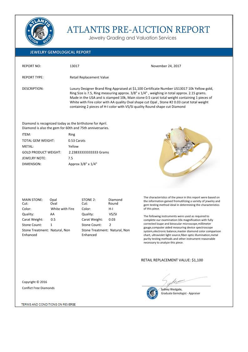 REF-16K5W -13017 ---- 0.53 CTW Opal & Diamond Ring 10K Yellow Gold ---- Luxury Designer Brand Ring Appraised at $1,100 Certificate Number US13017 10k Yellow gold, Ring Size is 7.5, Ring measuring approx. 3/8" x 1/4" , weighing in total approx. 2.15 grams. Made in the USA and is stamped 10k, Main stone 0.5 carat total weight containing 1 pieces of White with Fire color with AA quality Oval shape cut Opal , Stone #2 0.03 carat total weight containing 2 pieces of H-I color with VS/SI quality Round shape cut Diamond