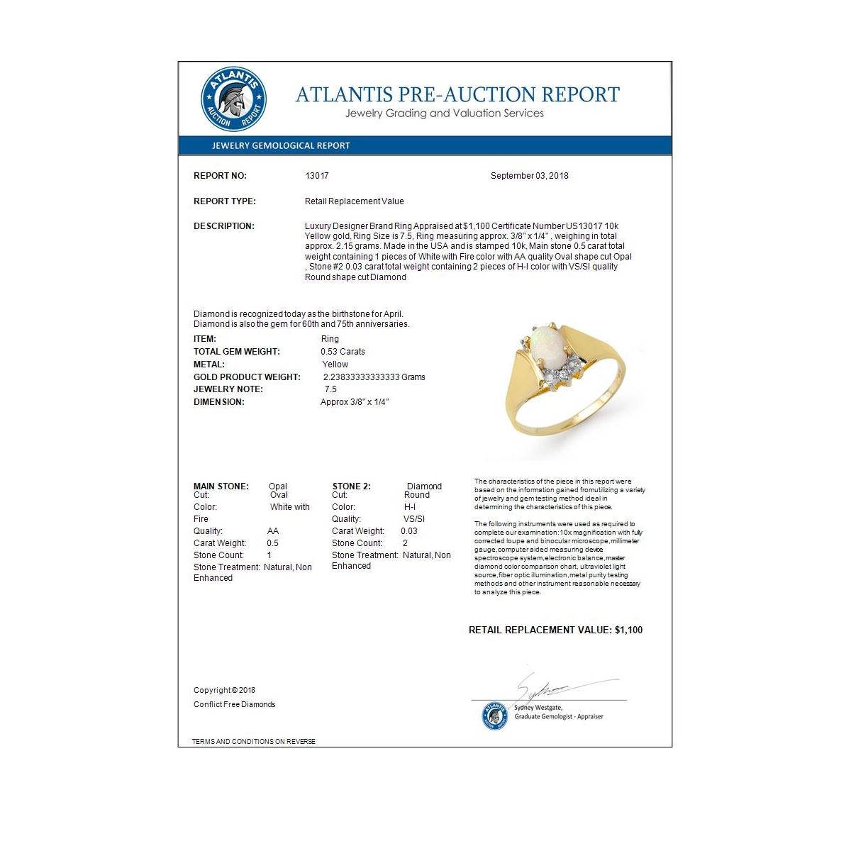 REF-16K5W -13017 ---- 0.53 CTW Opal & Diamond Ring 10K Yellow Gold ---- Luxury Designer Brand Ring Appraised at $1,100 Certificate Number US13017 10k Yellow gold, Ring Size is 7.5, Ring measuring approx. 3/8" x 1/4" , weighing in total approx. 2.15 grams. Made in the USA and is stamped 10k, Main stone 0.5 carat total weight containing 1 pieces of White with Fire color with AA quality Oval shape cut Opal , Stone #2 0.03 carat total weight containing 2 pieces of H-I color with VS/SI quality Round shape cut Diamond