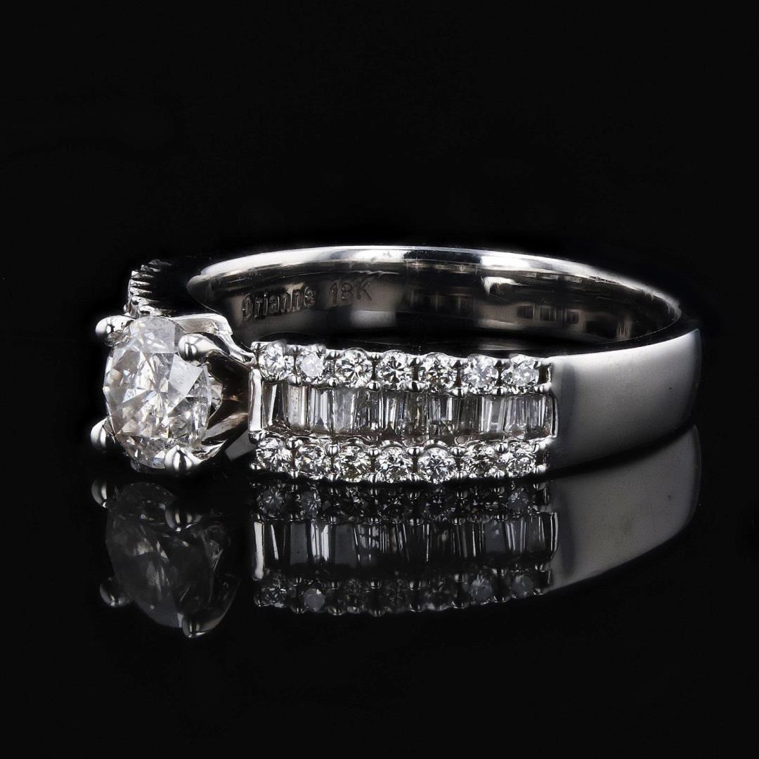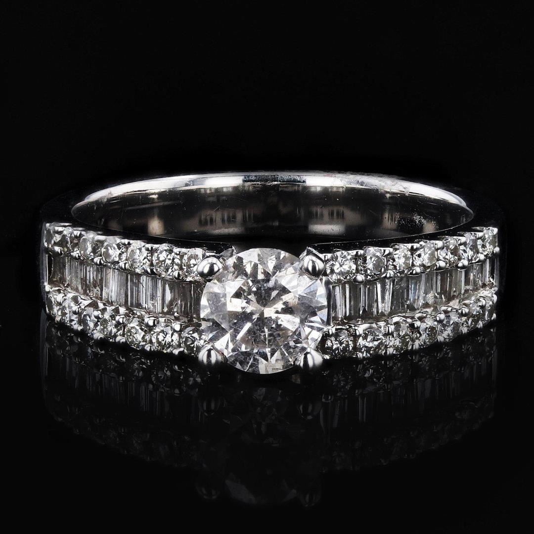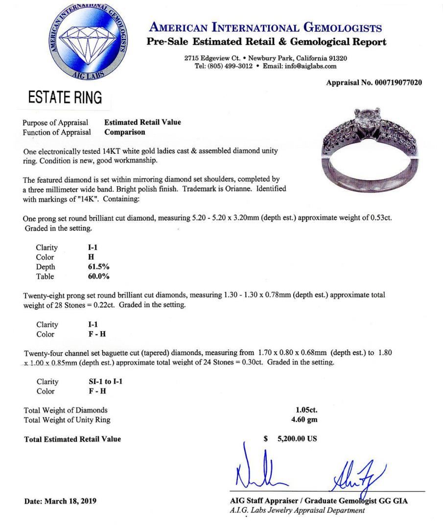 One electronically tested 14KT white gold ladies cast & assembled diamond unity ring. Condition is new, good workmanship. The featured diamond is set within mirroring diamond set shoulders, completed by a three millimeter wide band. Bright polish finish. Trademark is Orianne. Identified with markings of "14K". Containing: One prong set round brilliant cut diamond, measuring 5.20 - 5.20 x 3.20mm (depth est.) approximate weight of 0.53ct. Graded in the setting. Clarity I1 Color H Depth 61.5% Table 60.0% Twenty-eight prong set round brilliant cut diamonds, measuring 1.30 - 1.30 x 0.78mm (depth est.) approximate total weight of 28 Stones = 0.22ctw. Graded in the setting. Clarity I1 Color F - H Twenty-four channel set baguette cut (tapered) diamonds, measuring from 1.70 x 0.80 x 0.68mm (depth est.) to 1.80 x 1.00 x 0.85mm (depth est.) approximate total weight of 24 Stones = 0.30ctw. Graded in the setting. Clarity SI1 to I1 Color F - H Total Weight of Diamonds 1.05ctw. Total Weight of Unity Ring 4.60 gm #LREF-3193