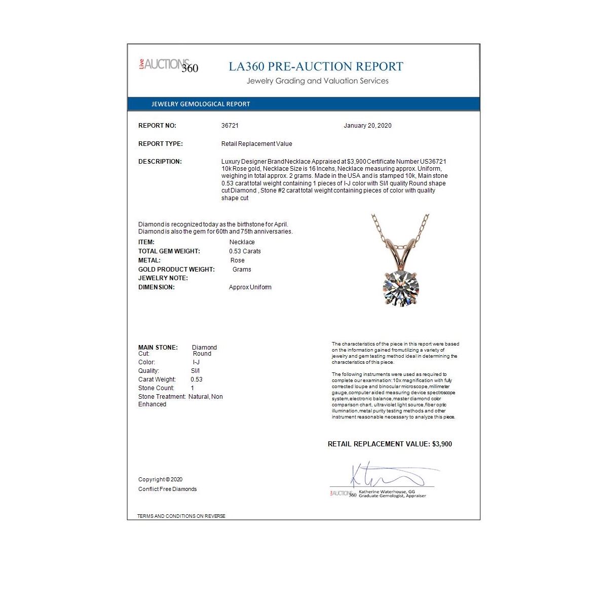 REF-40G8W - SKU: 36721 ---- 0.53 ctw Certified Quality Diamond Solitaire Necklace 10k Rose Gold