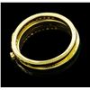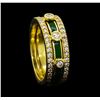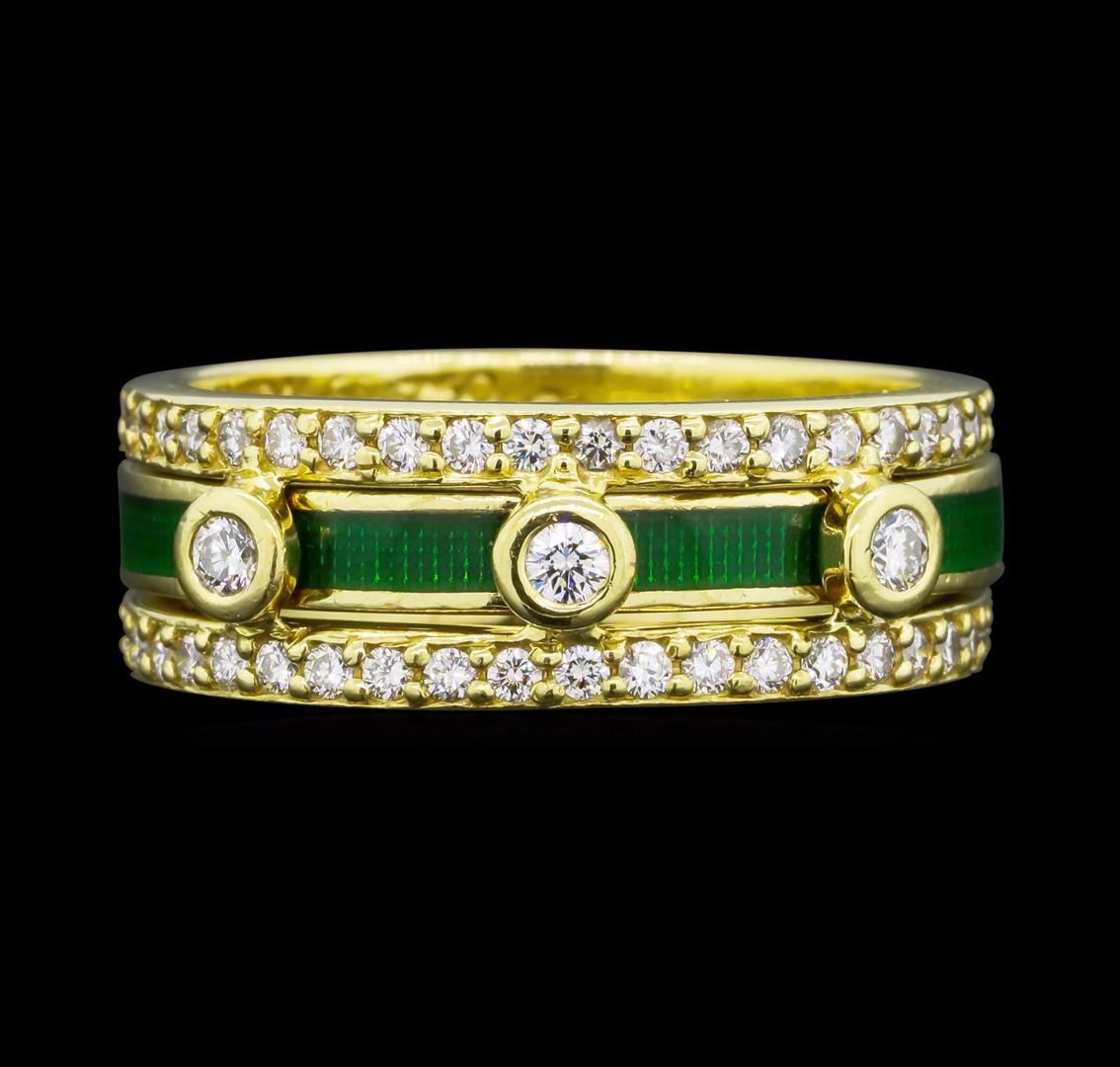 One set electronically tested 18KT yellow gold lady's cast fashion three row band with insert with a bright polish finish. The featured lady's band has a green enamel inlay and a triple shank measuring 7.20 millimeters wide. Trademark is Hidalgo. Identified with markings of '750'. Condition is like new, good workmanship. Containing: Three bezel set round brilliant cut diamonds, measuring 2.40 - 2.30 x 1.46mm (depth est.) approximate total weight of 3 Stones = 0.15ct. Graded in the setting. Clarity VS-1 to VS-2. Color: F - G Cut Very Good Forty prong set round brilliant cut diamonds, measuring 1.40 - 1.30 x 0.84mm (depth est.) approximate total weight of 40 Stones = 0.38ct. Graded in the setting. Clarity VS-1 to VS-2. Color: F - G Cut Very Good. Total Weight of Diamonds 0.53ct.. Total Weight of Band With Insert 11.30gm GAS Appraised at $3,755.00.