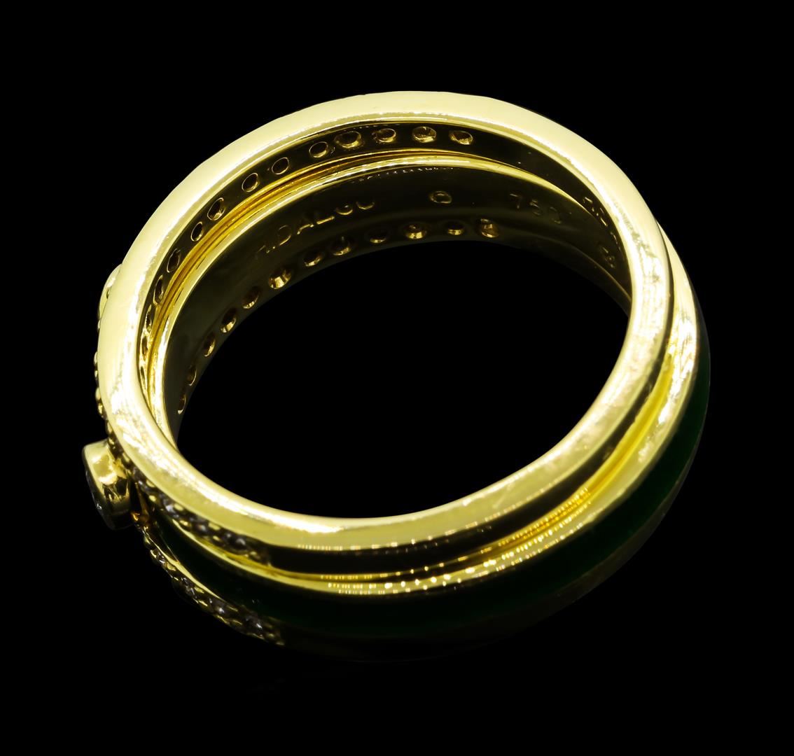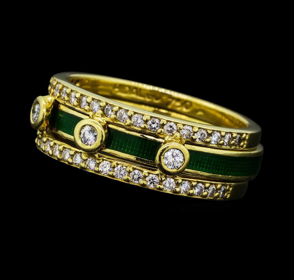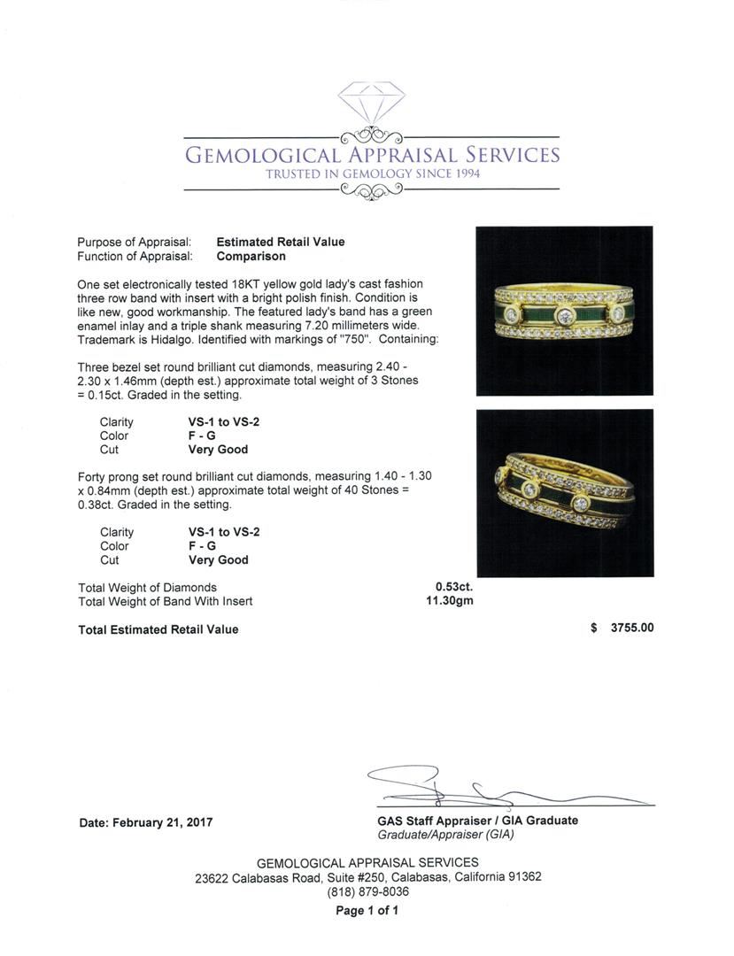One set electronically tested 18KT yellow gold lady's cast fashion three row band with insert with a bright polish finish. The featured lady's band has a green enamel inlay and a triple shank measuring 7.20 millimeters wide. Trademark is Hidalgo. Identified with markings of '750'. Condition is like new, good workmanship. Containing: Three bezel set round brilliant cut diamonds, measuring 2.40 - 2.30 x 1.46mm (depth est.) approximate total weight of 3 Stones = 0.15ct. Graded in the setting. Clarity VS-1 to VS-2. Color: F - G Cut Very Good Forty prong set round brilliant cut diamonds, measuring 1.40 - 1.30 x 0.84mm (depth est.) approximate total weight of 40 Stones = 0.38ct. Graded in the setting. Clarity VS-1 to VS-2. Color: F - G Cut Very Good. Total Weight of Diamonds 0.53ct.. Total Weight of Band With Insert 11.30gm GAS Appraised at $3,755.00.