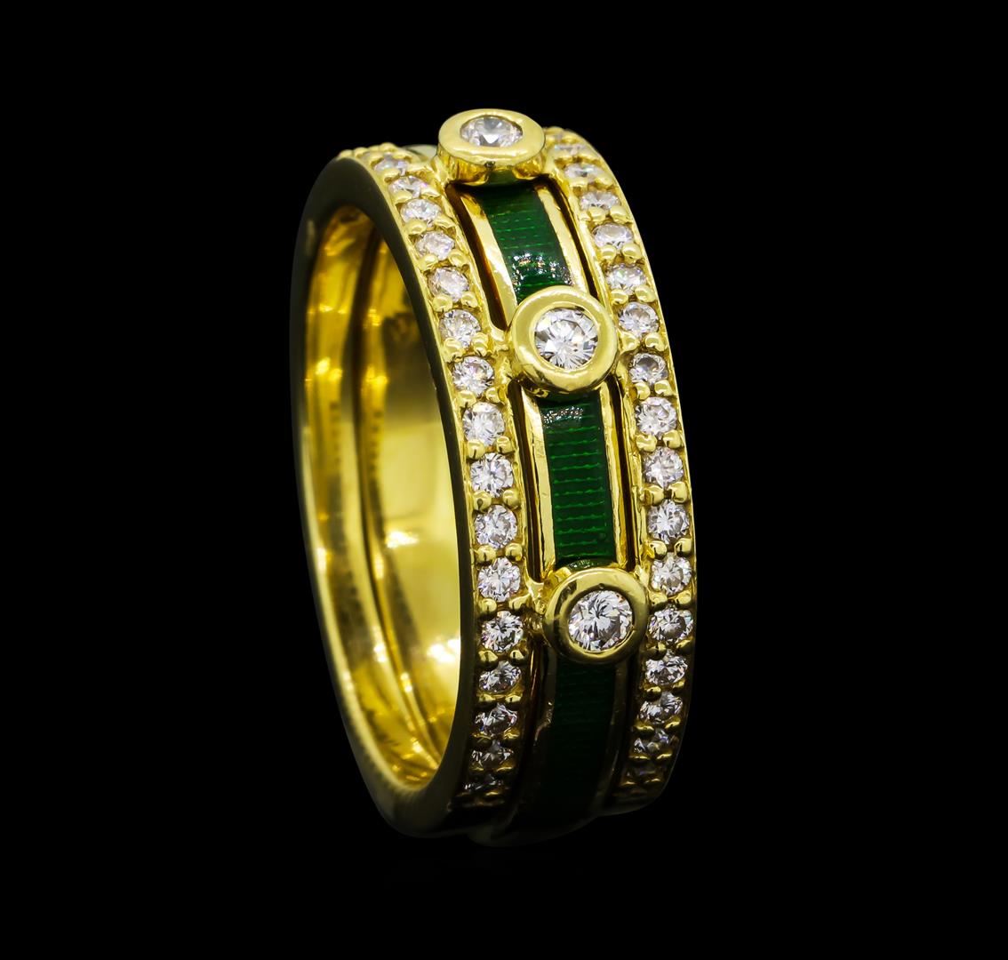One set electronically tested 18KT yellow gold lady's cast fashion three row band with insert with a bright polish finish. The featured lady's band has a green enamel inlay and a triple shank measuring 7.20 millimeters wide. Trademark is Hidalgo. Identified with markings of '750'. Condition is like new, good workmanship. Containing: Three bezel set round brilliant cut diamonds, measuring 2.40 - 2.30 x 1.46mm (depth est.) approximate total weight of 3 Stones = 0.15ct. Graded in the setting. Clarity VS-1 to VS-2. Color: F - G Cut Very Good Forty prong set round brilliant cut diamonds, measuring 1.40 - 1.30 x 0.84mm (depth est.) approximate total weight of 40 Stones = 0.38ct. Graded in the setting. Clarity VS-1 to VS-2. Color: F - G Cut Very Good. Total Weight of Diamonds 0.53ct.. Total Weight of Band With Insert 11.30gm GAS Appraised at $3,755.00.