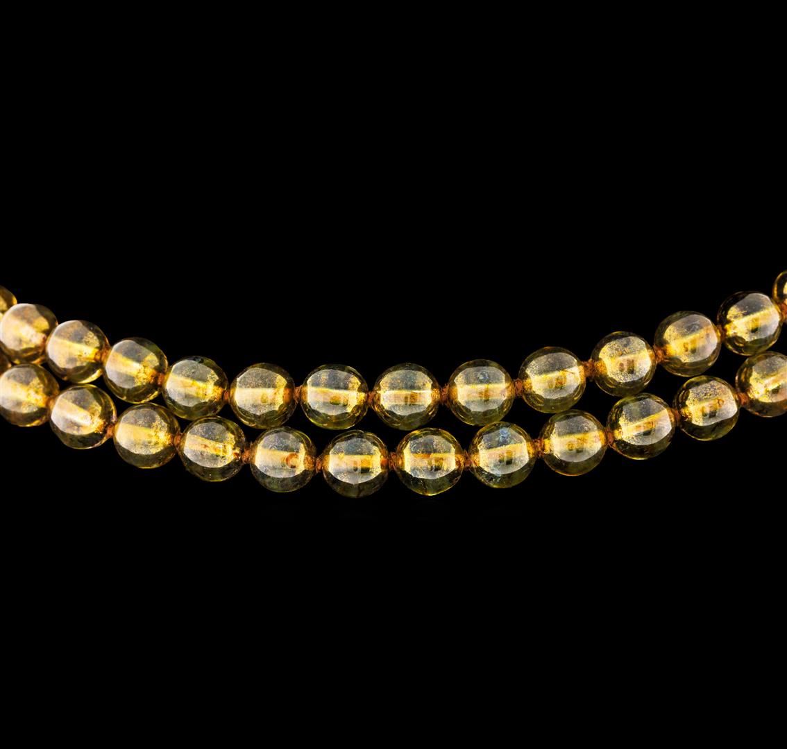 One electronically tested 18KT yellow gold ladies cast & assembled diamond and crystal necklace. Sixteen and one-quarter inch length necklace features double stranded brown crystal beads, terminating in diamond accented hinged snap locking clasps connected by a removable section. Bright and patterned finish. Trademark is Judith Ripka. Identified with markings of '18K'. Condition is good. Containing: Twelve prong set round brilliant cut diamonds, measuring 2.30 - 2.30 x 1.38mm (depth est.) approximate total weight of 12 Stones = 0.53ct. Graded in the setting. Clarity SI-1 to SI-2. Color: G - H One uniform double strand pearl necklace knotted, containing 83 akoya cultured pearls, 7.5mm in size. The pearls are white in color with an excellent luster, round.. Total Weight of Diamonds 0.53ct.. Total Weight of Necklace 82.33gm. AIG Appraised at $4,000.00.