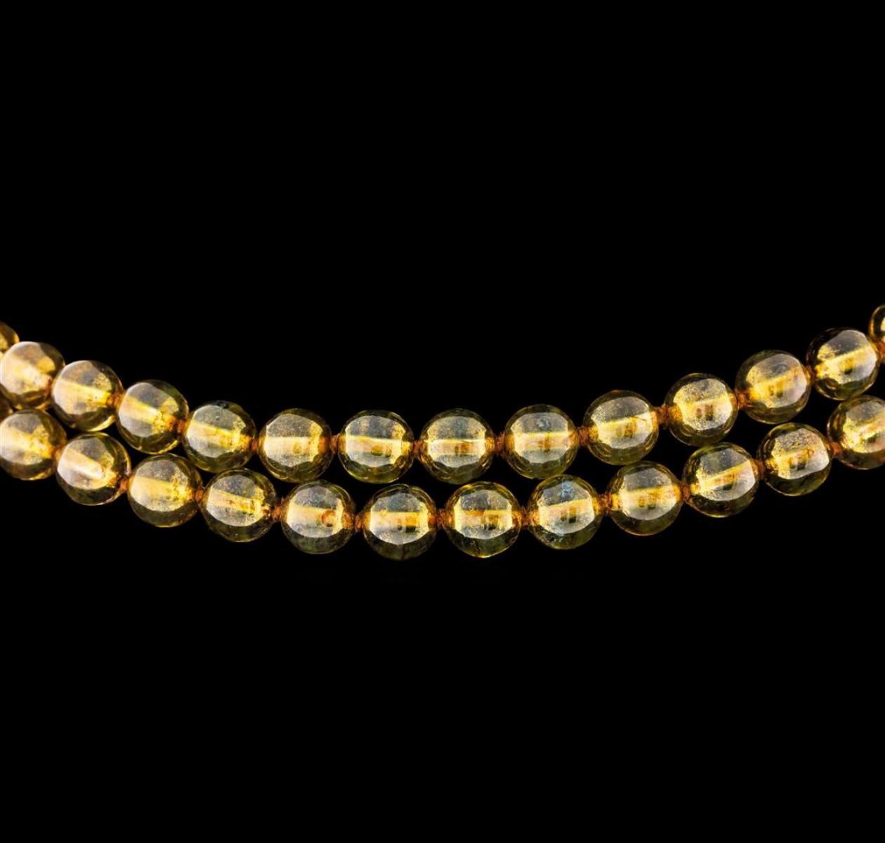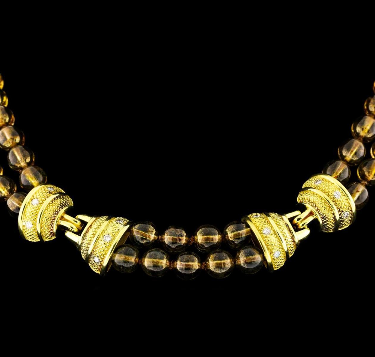 One electronically tested 18KT yellow gold ladies cast & assembled diamond and crystal necklace. Sixteen and one-quarter inch length necklace features double stranded brown crystal beads, terminating in diamond accented hinged snap locking clasps connected by a removable section. Bright and patterned finish. Trademark is Judith Ripka. Identified with markings of '18K'. Condition is good. Containing: Twelve prong set round brilliant cut diamonds, measuring 2.30 - 2.30 x 1.38mm (depth est.) approximate total weight of 12 Stones = 0.53ct. Graded in the setting. Clarity SI-1 to SI-2. Color: G - H One uniform double strand pearl necklace knotted, containing 83 akoya cultured pearls, 7.5mm in size. The pearls are white in color with an excellent luster, round.. Total Weight of Diamonds 0.53ct.. Total Weight of Necklace 82.33gm. AIG Appraised.