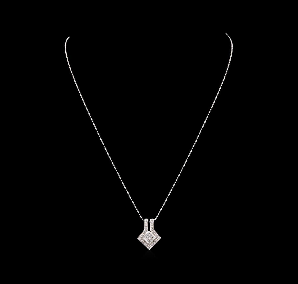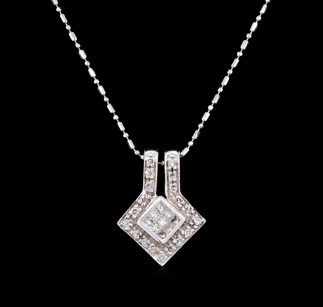One electronically tested 14KT white gold ladies cast & assembled diamond pendant with chain. The pendant features an organized diamond cluster set within a stylized bezel, completed by a diamond set split bail. The pendant is supported by an eighteen inch length 14KT white gold bead style chain, terminating in a spring ring clasp. Bright polish finish. Identified with markings of "14K". Condition is good. Containing: Nine invisible set princess cut diamonds, measuring 1.70 x 1.60 x 1.20mm (depth est.) approximate total weight of 9 Stones = 0.28ct. Graded in the setting. Clarity: SI-1 to I-1 . Color: G - I Nineteen prong set round brilliant cut diamonds, measuring 1.50 - 1.40 x 0.87mm (depth est.) approximate total weight of 19 Stones = 0.25ct. Graded in the setting. Clarity: I-1 to I-2 . Color: G - I. Total Weight of Diamonds 0.53ct.. Total Weight of Pendant With Chain 4.24gm. AIG Appraised.