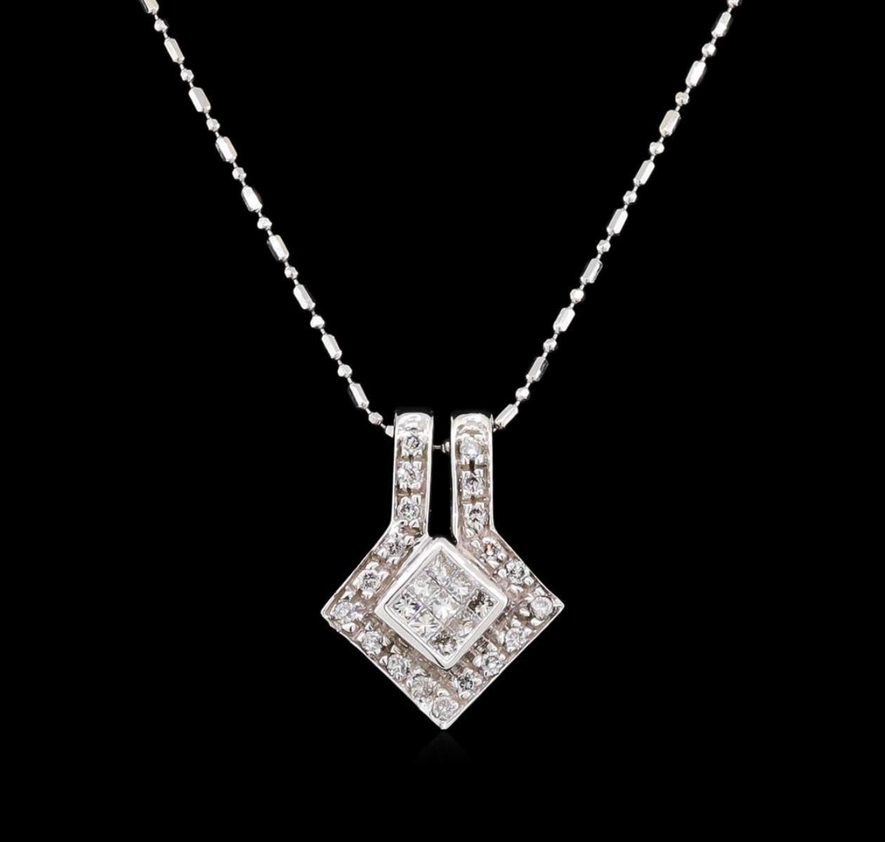 One electronically tested 14KT white gold ladies cast & assembled diamond pendant with chain. The pendant features an organized diamond cluster set within a stylized bezel, completed by a diamond set split bail. The pendant is supported by an eighteen inch length 14KT white gold bead style chain, terminating in a spring ring clasp. Bright polish finish. Identified with markings of "14K". Condition is good. Containing: Nine invisible set princess cut diamonds, measuring 1.70 x 1.60 x 1.20mm (depth est.) approximate total weight of 9 Stones = 0.28ct. Graded in the setting. Clarity: SI-1 to I-1 . Color: G - I Nineteen prong set round brilliant cut diamonds, measuring 1.50 - 1.40 x 0.87mm (depth est.) approximate total weight of 19 Stones = 0.25ct. Graded in the setting. Clarity: I-1 to I-2 . Color: G - I. Total Weight of Diamonds 0.53ct.. Total Weight of Pendant With Chain 4.24gm. AIG Appraised.