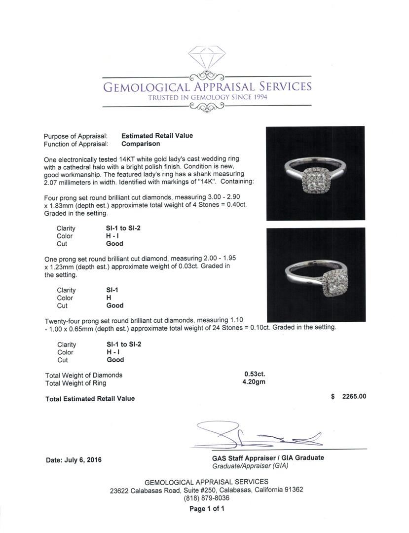 One electronically tested 14KT white gold lady's cast wedding ring with a cathedral halo with a bright polish finish. The featured lady's ring has a shank measuring 2.07 millimeters in width. Identified with markings of '14K'. Condition is new, good workmanship. Containing: Four prong set round brilliant cut diamonds, measuring 3.00 - 2.90 x 1.83mm (depth est.) approximate total weight of 4 Stones = 0.40ct. Graded in the setting. Clarity SI-1 to SI-2. Color: H - I Cut Good One prong set round brilliant cut diamond, measuring 2.00 - 1.95 x 1.23mm (depth est.) approximate weight of 0.03ct. Graded in the setting. Clarity SI-1. Color: H Cut Good Twenty-Four prong set round brilliant cut diamonds, measuring 1.10 - 1.00 x 0.65mm (depth est.) approximate total weight of 24 Stones = 0.10ct. Graded in the setting. Clarity SI-1 to SI-2. Color: H - I Cut Good. Total Weight of Diamonds 0.53ct.. Total Weight of Ring 4.20gm. GAS Appraised at $2,265.00.