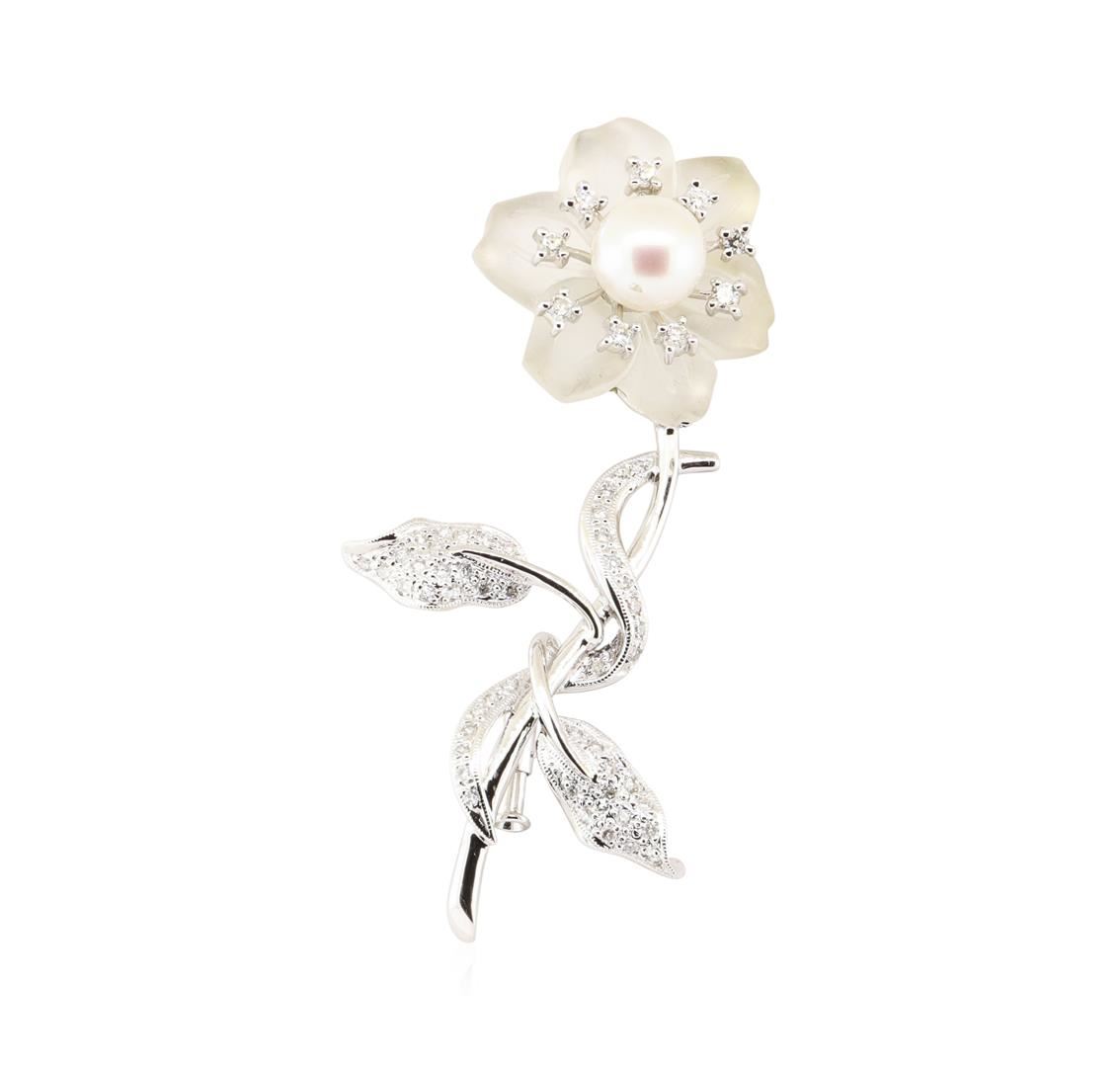 One electronically tested 18KT white gold lady's combination cast & assembled fashion floral design pin with a bright polish with milgrain detailing finish. The featured lady's pin has a frosted crystal that has been hand cut into a floral design. The pin measures approximately fifty-seven millimeters in length. Identified with markings of '18K 750'. Condition is new, good workmanship. Containing: One akoya cultured pearl, 8.0mm to 8.0mm in size. The pearl is white in color, ros� overtone with a good luster, round, and clean. Graded in the setting. Nine prong set round brilliant cut diamonds, measuring 1.75 - 1.70 x 1.07mm (depth est.) approximate total weight of 9 Stones = 0.18ct. Graded in the setting. Color H - I Clarity SI-1 to SI-2 Cut Good Forty-Eight bead set round brilliant cut diamonds, measuring 1.30 - 1.20 x 0.78mm (depth est.) approximate total weight of 48 Stones = 0.35ct. Graded in the setting. Color H - I Clarity SI-1 to I-1 Cut Good. Total Weight of Diamonds 0.53ct.. Total Weight of Pin 10.70gm GAS Appraised at $4240.00. GAS Appraised.