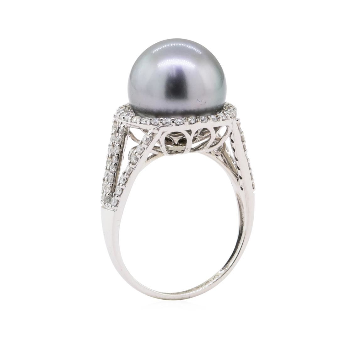 One electronically tested 14KT white gold ladies cast & assembled Tahitian cultured pearl & diamond ring. The ring features a Tahitian cultured pearl set within a diamond bezel, supported by diamond set three way split shoulders, completed by a two millimeter wide band. Bright polish finish. Trademark is Orianne. Identified with markings of "14K". Condition is new, good workmanship. Containing: One Tahitian cultured pearl, 12.0mm in size. The pearl is 06 in color with a good luster, round, mostly clean Graded in the setting. Tahitian cultured pearls form in the large "Black Lipped" Pinctada Margaritiferid oyster, which is about twice the size of the Japanese Akoya oyster. This warm water species from across the central and South Pacific Ocean is at home in the bays and lagoons of the islands & atolls of French Polynesia. Tahitian cultured pearl farmers generally raise their oysters in lagoons. Tahitian cultured pearls take from two to four years to form. Black pearls are known for their iridescent, vibrant, almost metallic natural colors, unique among saltwater cultured pearls. Though commonly called "Tahitian" pearls, they are actually gray, to a lighter or darker degree. Tahitian pearls have the unique ability to display a variety of colors at the same time, which can be seen glistening on their surface. Seventy-Four prong set round brilliant cut diamonds exact total weight 74 Stones = 0.53ct. Graded in the setting. Clarity I-1 to I-2 Color F - H Total Weight of Diamonds 0.53 ct. Total Weight of Ring 5.50 gm Estimated Retail Value $ 3,960.00 US AIG Appraised.