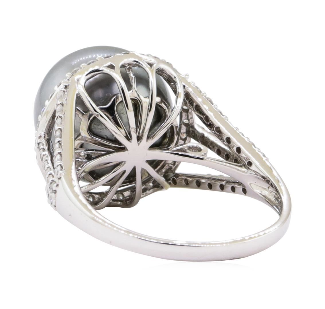 One electronically tested 14KT white gold ladies cast & assembled Tahitian cultured pearl & diamond ring. The ring features a Tahitian cultured pearl set within a diamond bezel, supported by diamond set three way split shoulders, completed by a two millimeter wide band. Bright polish finish. Trademark is Orianne. Identified with markings of "14K". Condition is new, good workmanship. Containing: One Tahitian cultured pearl, 12.0mm in size. The pearl is 06 in color with a good luster, round, mostly clean Graded in the setting. Tahitian cultured pearls form in the large "Black Lipped" Pinctada Margaritiferid oyster, which is about twice the size of the Japanese Akoya oyster. This warm water species from across the central and South Pacific Ocean is at home in the bays and lagoons of the islands & atolls of French Polynesia. Tahitian cultured pearl farmers generally raise their oysters in lagoons. Tahitian cultured pearls take from two to four years to form. Black pearls are known for their iridescent, vibrant, almost metallic natural colors, unique among saltwater cultured pearls. Though commonly called "Tahitian" pearls, they are actually gray, to a lighter or darker degree. Tahitian pearls have the unique ability to display a variety of colors at the same time, which can be seen glistening on their surface. Seventy-Four prong set round brilliant cut diamonds exact total weight 74 Stones = 0.53ct. Graded in the setting. Clarity I-1 to I-2 Color F - H Total Weight of Diamonds 0.53 ct. Total Weight of Ring 5.50 gm Estimated Retail Value $ 3,960.00 US