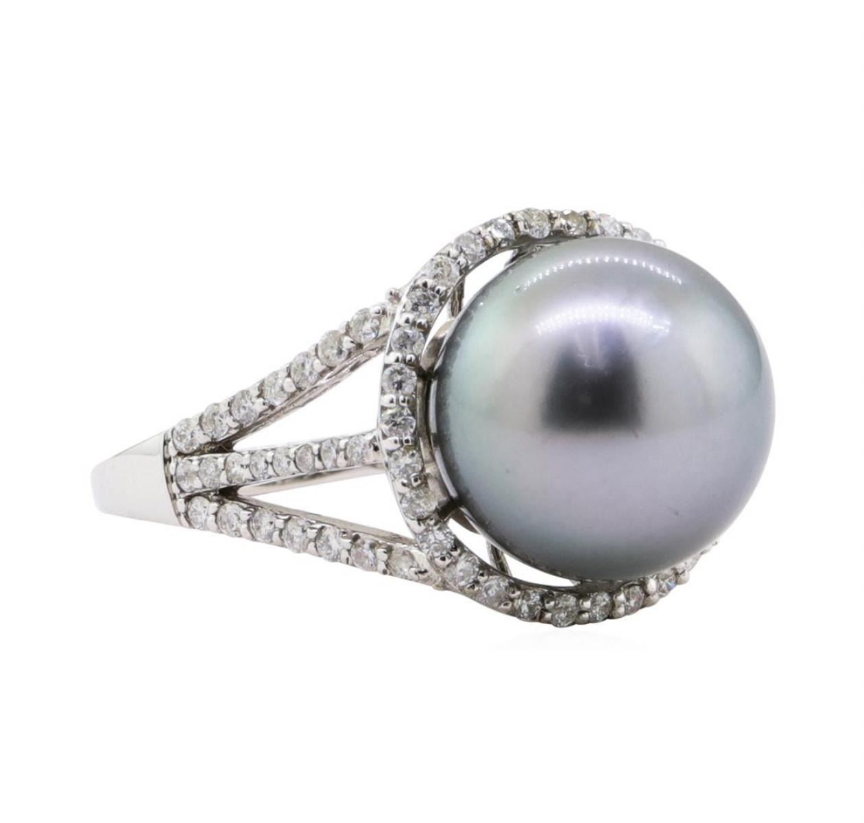 One electronically tested 14KT white gold ladies cast & assembled Tahitian cultured pearl & diamond ring. The ring features a Tahitian cultured pearl set within a diamond bezel, supported by diamond set three way split shoulders, completed by a two millimeter wide band. Bright polish finish. Trademark is Orianne. Identified with markings of "14K". Condition is new, good workmanship. Containing: One Tahitian cultured pearl, 12.0mm in size. The pearl is 06 in color with a good luster, round, mostly clean Graded in the setting. Tahitian cultured pearls form in the large "Black Lipped" Pinctada Margaritiferid oyster, which is about twice the size of the Japanese Akoya oyster. This warm water species from across the central and South Pacific Ocean is at home in the bays and lagoons of the islands & atolls of French Polynesia. Tahitian cultured pearl farmers generally raise their oysters in lagoons. Tahitian cultured pearls take from two to four years to form. Black pearls are known for their iridescent, vibrant, almost metallic natural colors, unique among saltwater cultured pearls. Though commonly called "Tahitian" pearls, they are actually gray, to a lighter or darker degree. Tahitian pearls have the unique ability to display a variety of colors at the same time, which can be seen glistening on their surface. Seventy-Four prong set round brilliant cut diamonds exact total weight 74 Stones = 0.53ct. Graded in the setting. Clarity I-1 to I-2 Color F - H Total Weight of Diamonds 0.53 ct. Total Weight of Ring 5.50 gm Estimated Retail Value $ 3,960.00 US